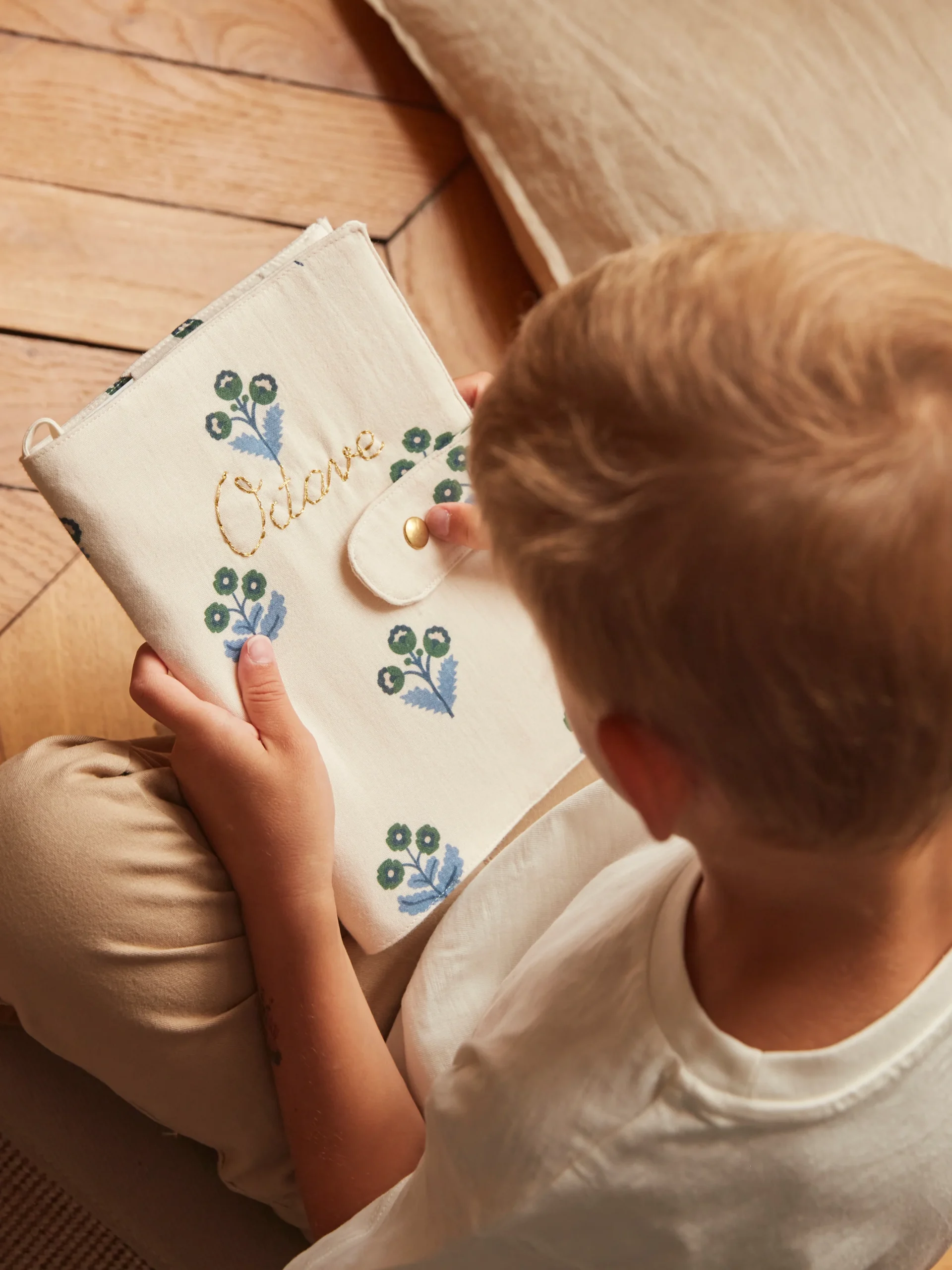 Protège carnet de santé personnalisé mixte en gaze de coton bleu et écru