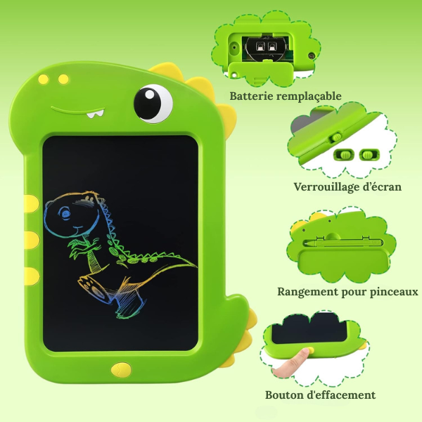 Avec sa forme amusante de dinosaure, l’ardoise transporte l’enfant dans un univers ludique. Il invente ses histoires, dessine ses propres dinosaures et explore des mondes imaginaires, tout en développant sa curiosité et son expression artistique.