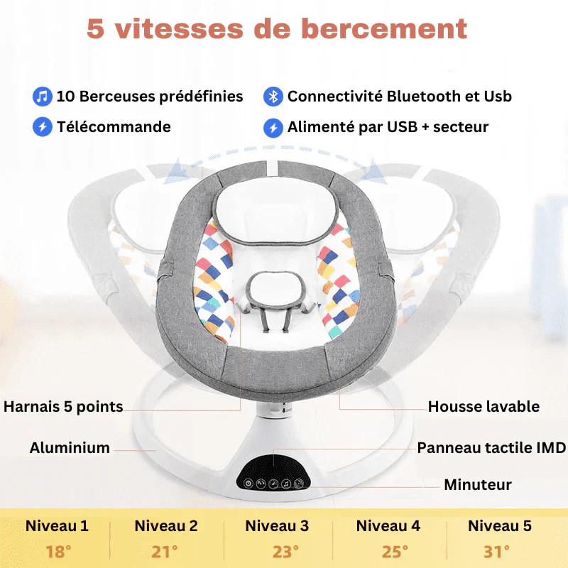 - Description : 5 Amplitudes de balancement différentes pour un confort et une sécurité optimaux / Fonction de synchronisation en 3 étapes pour plus de commodité / Bluetooth activé avec écran tactile/commande à distance/ Conception portable et légère pour un transport facile / Harnais 5 points et matériaux de qualité supérieure pour la sécurité et le confort.