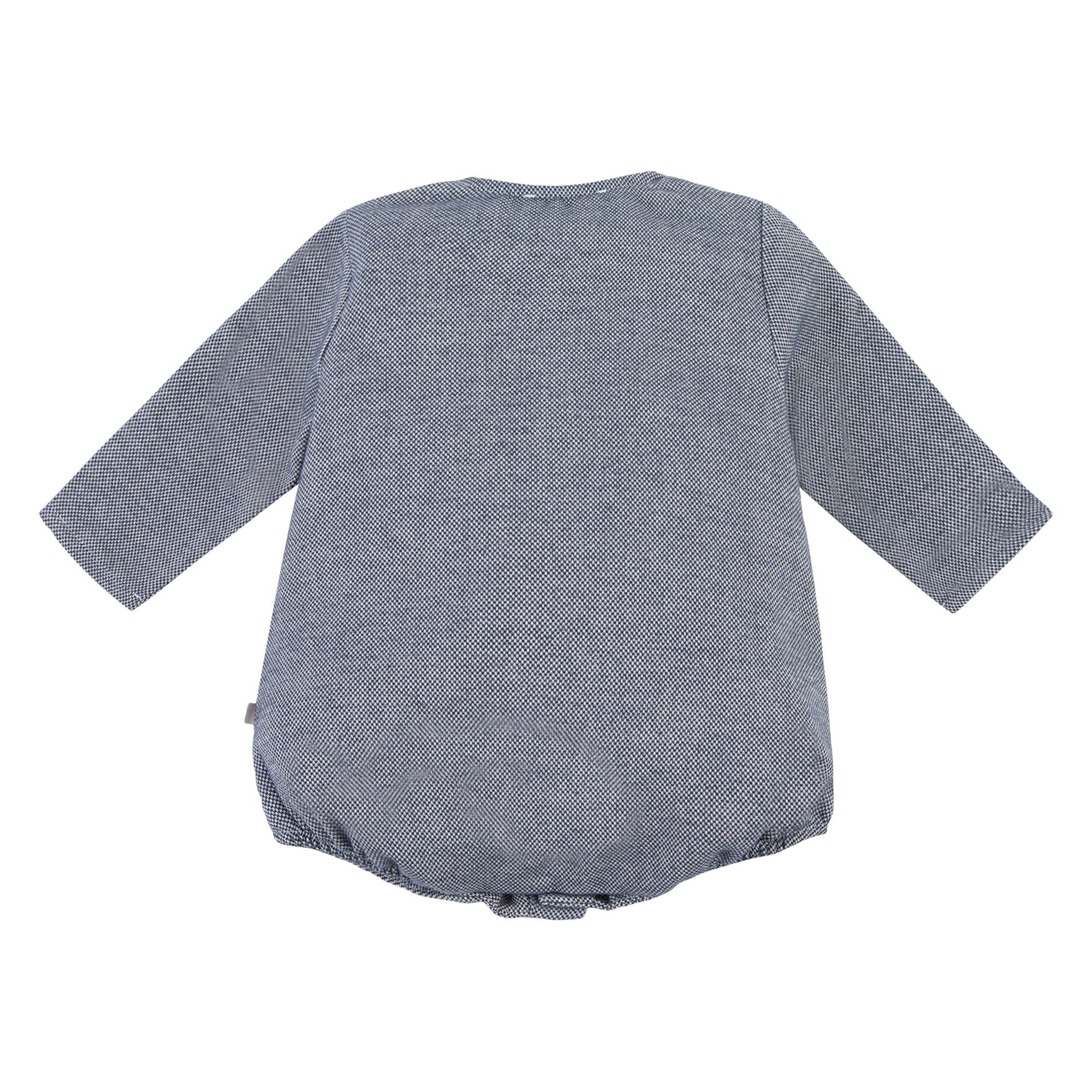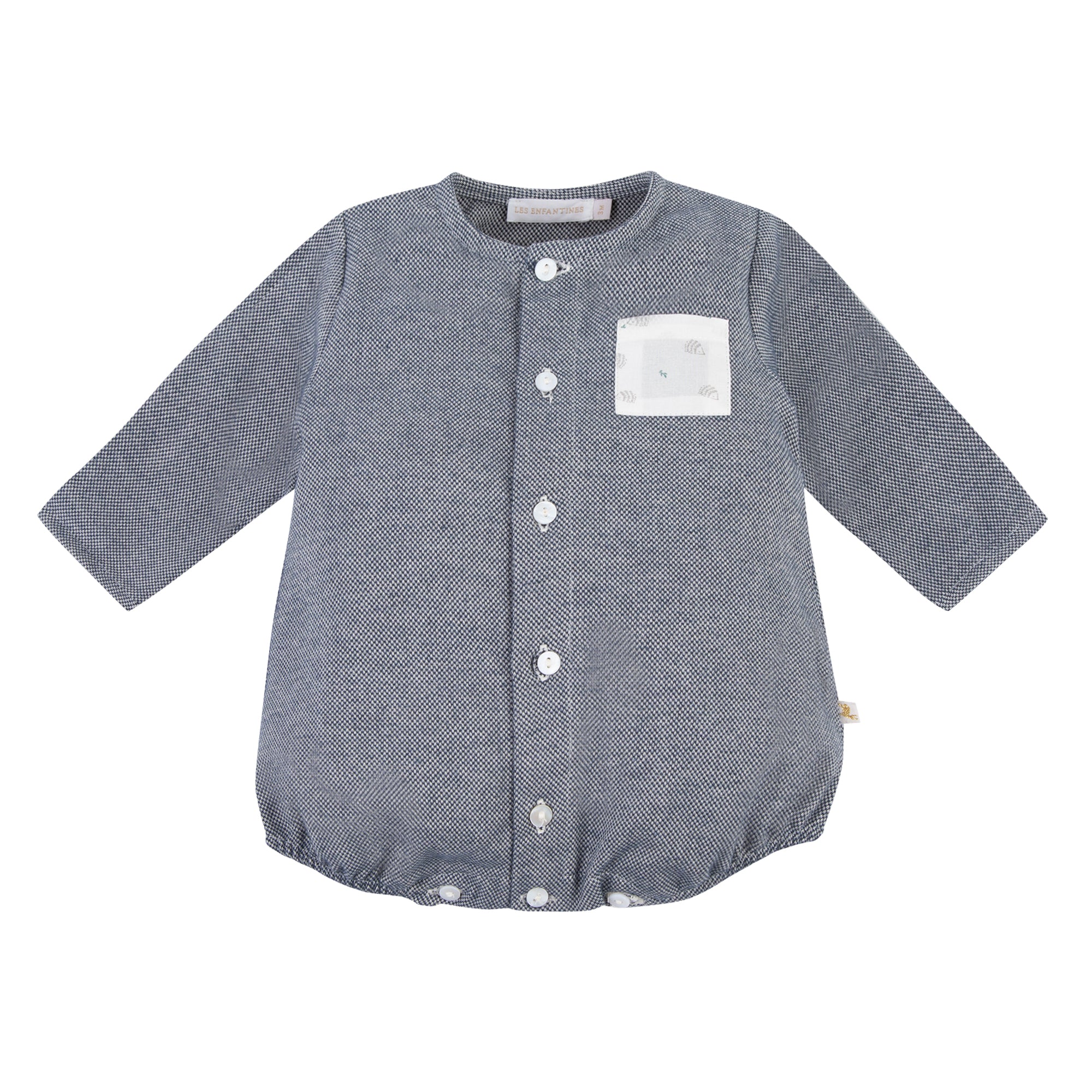 Une barboteuse comme on aime, douce et chaude, pour les garçons. De jolis boutons de nacre blancs sont sur le devant et à l’entrejambe.