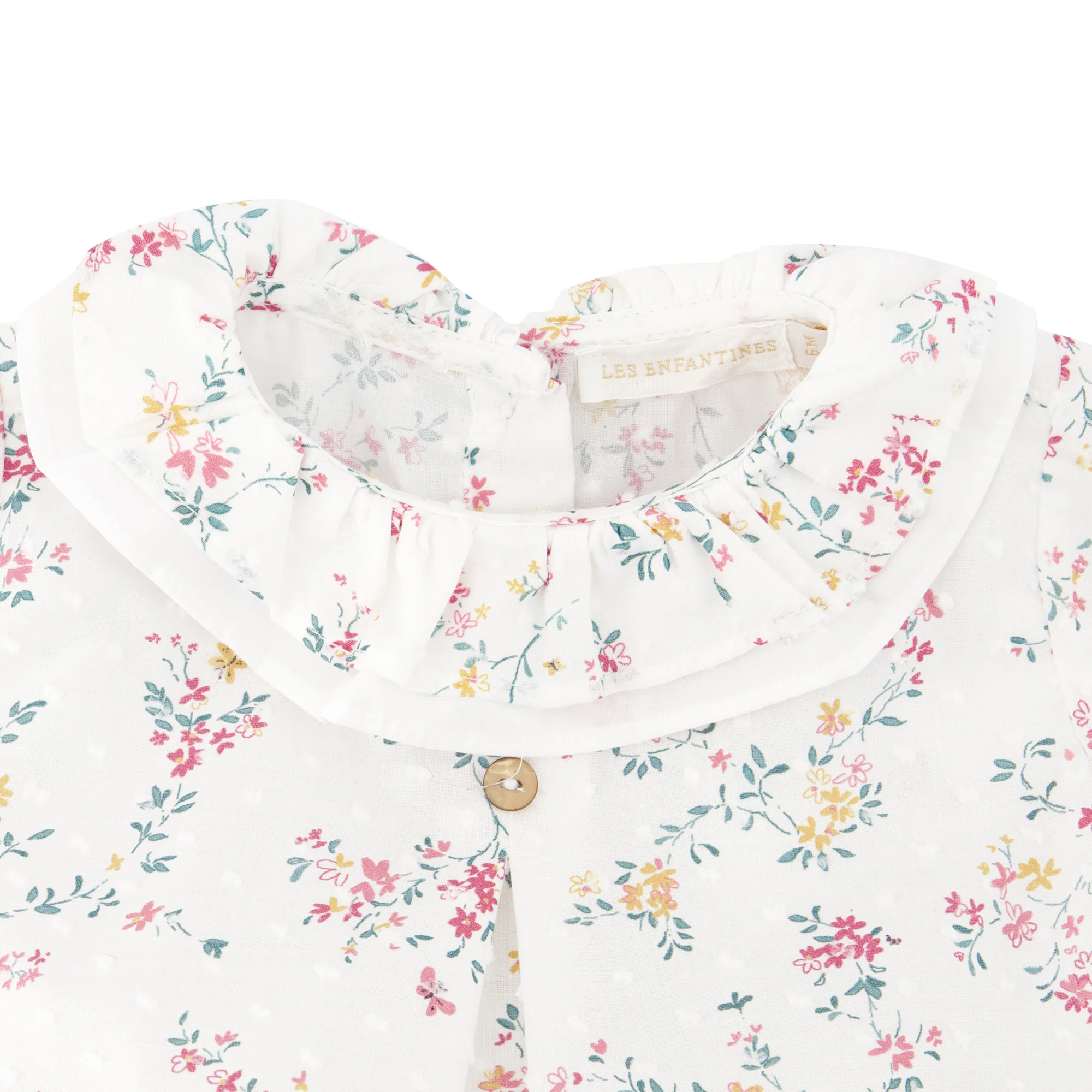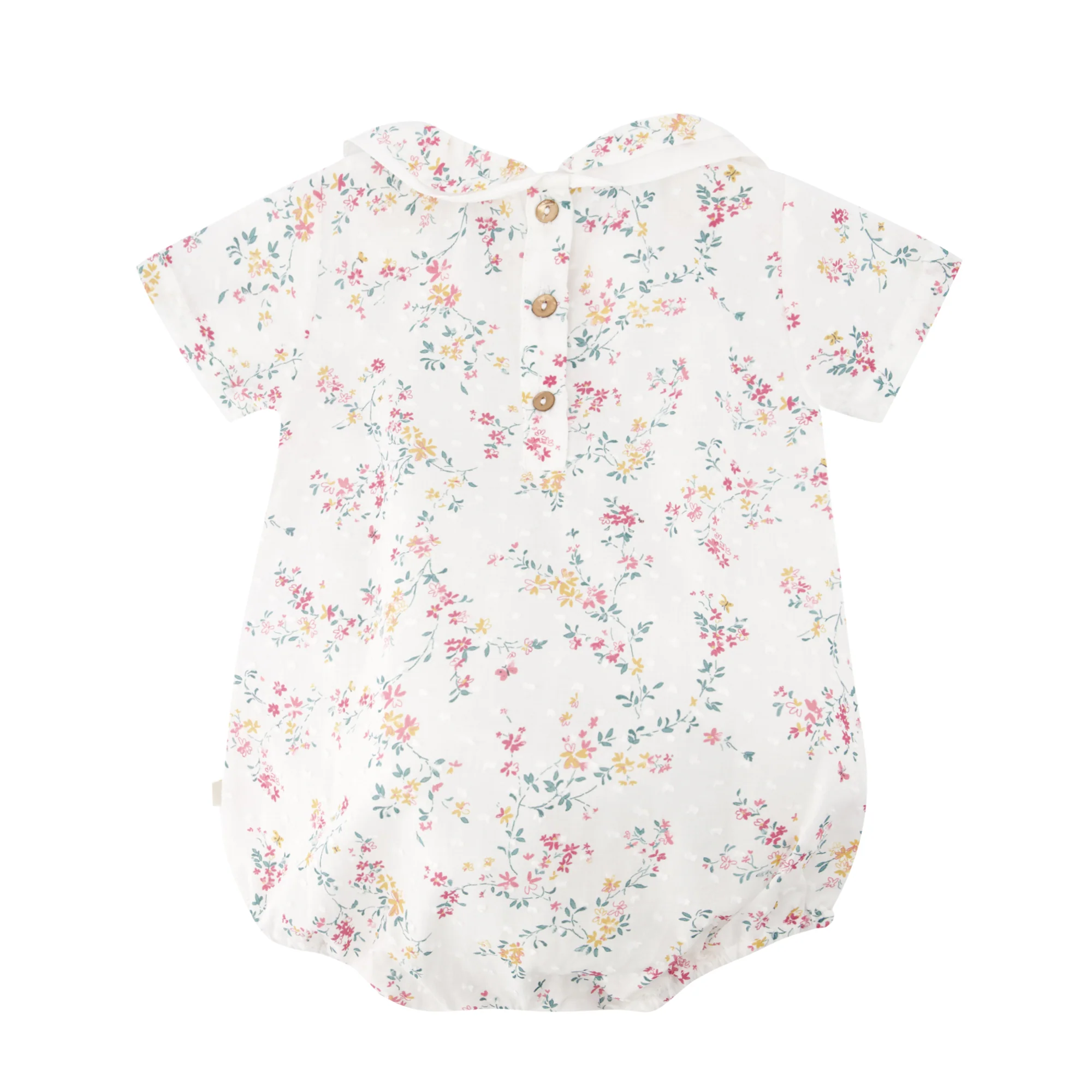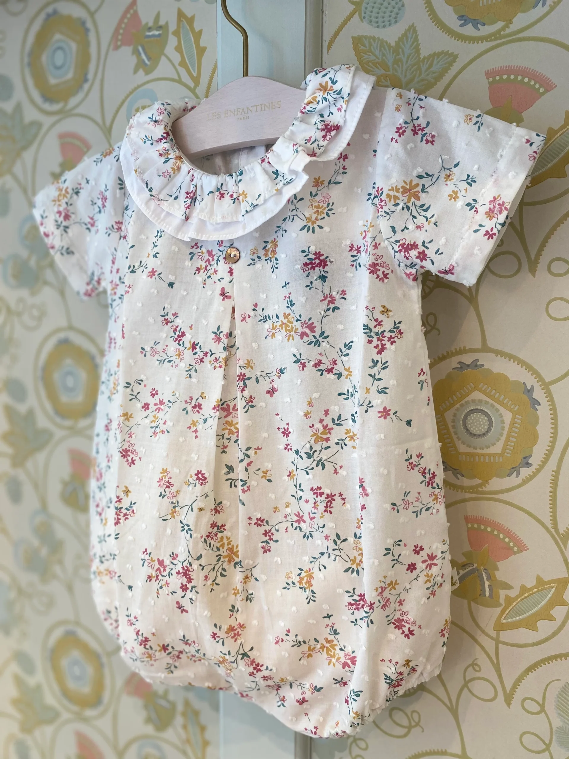 Elle est en plumetis avec un imprimé fleuri joyeux, libre et coloré. De petits papillons jaunes et roses se baladent sur ce tissu lumineux.