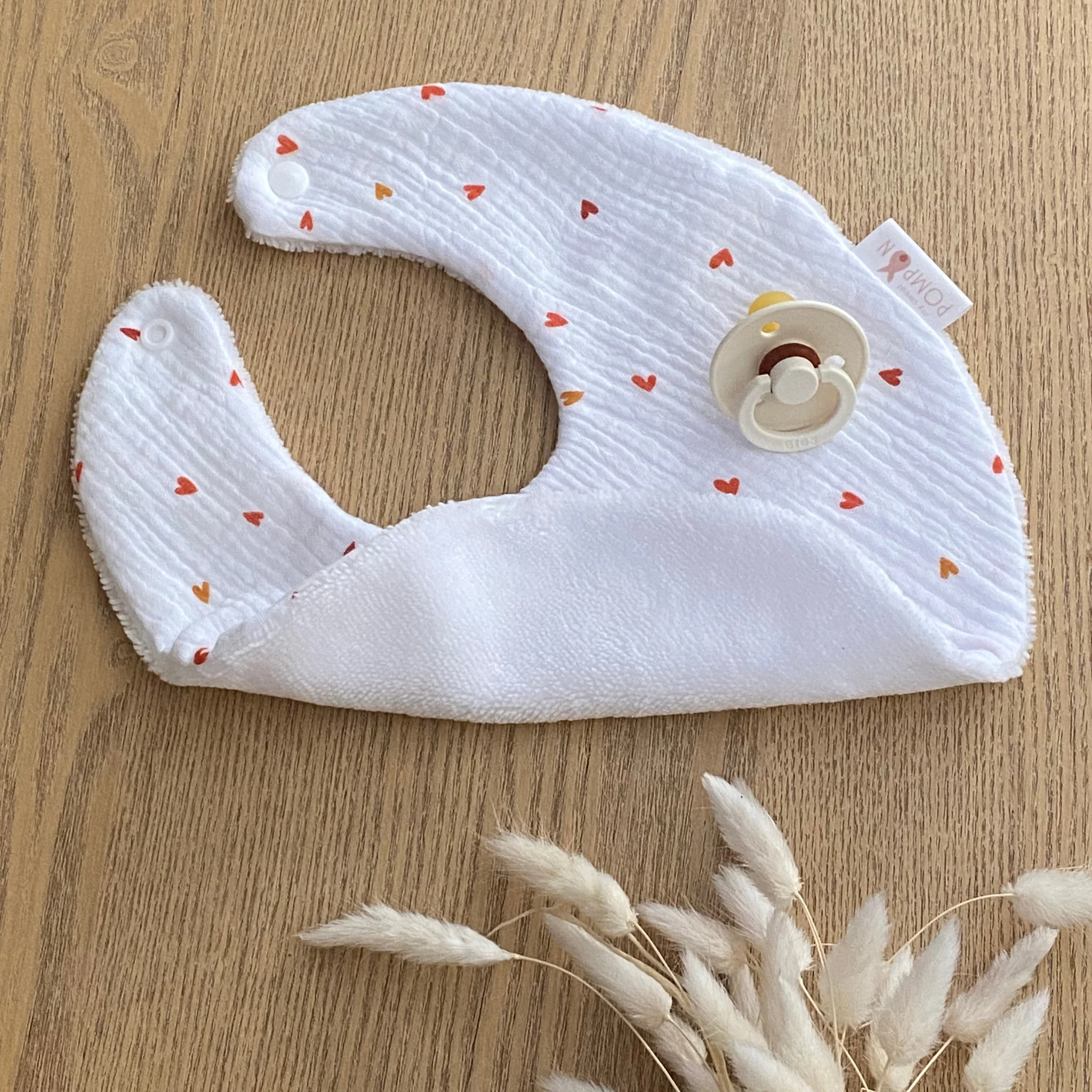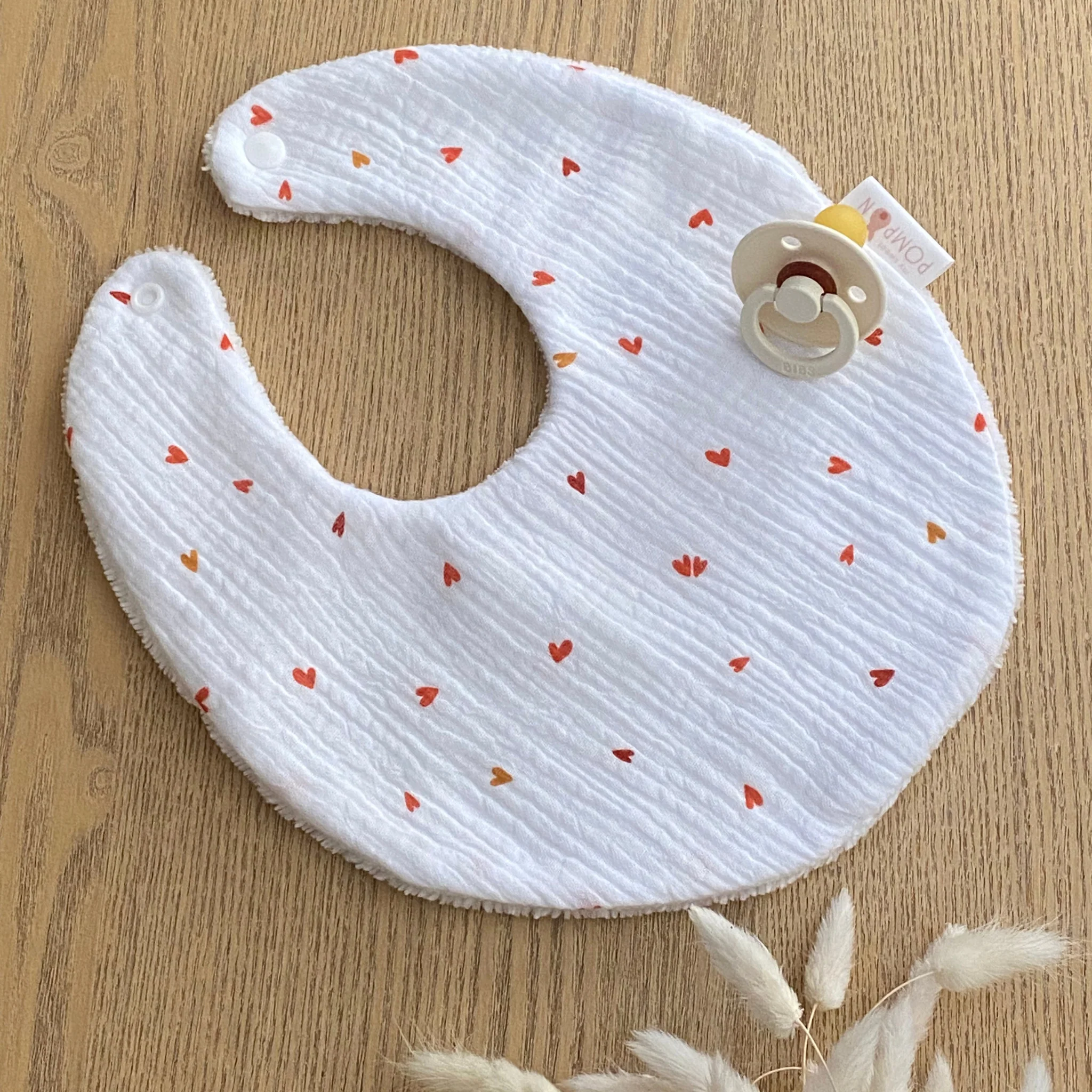 Bavoirs ronds en gaze de coton blanche motif 3 coeurs rouges brodés ou petits coeurs.