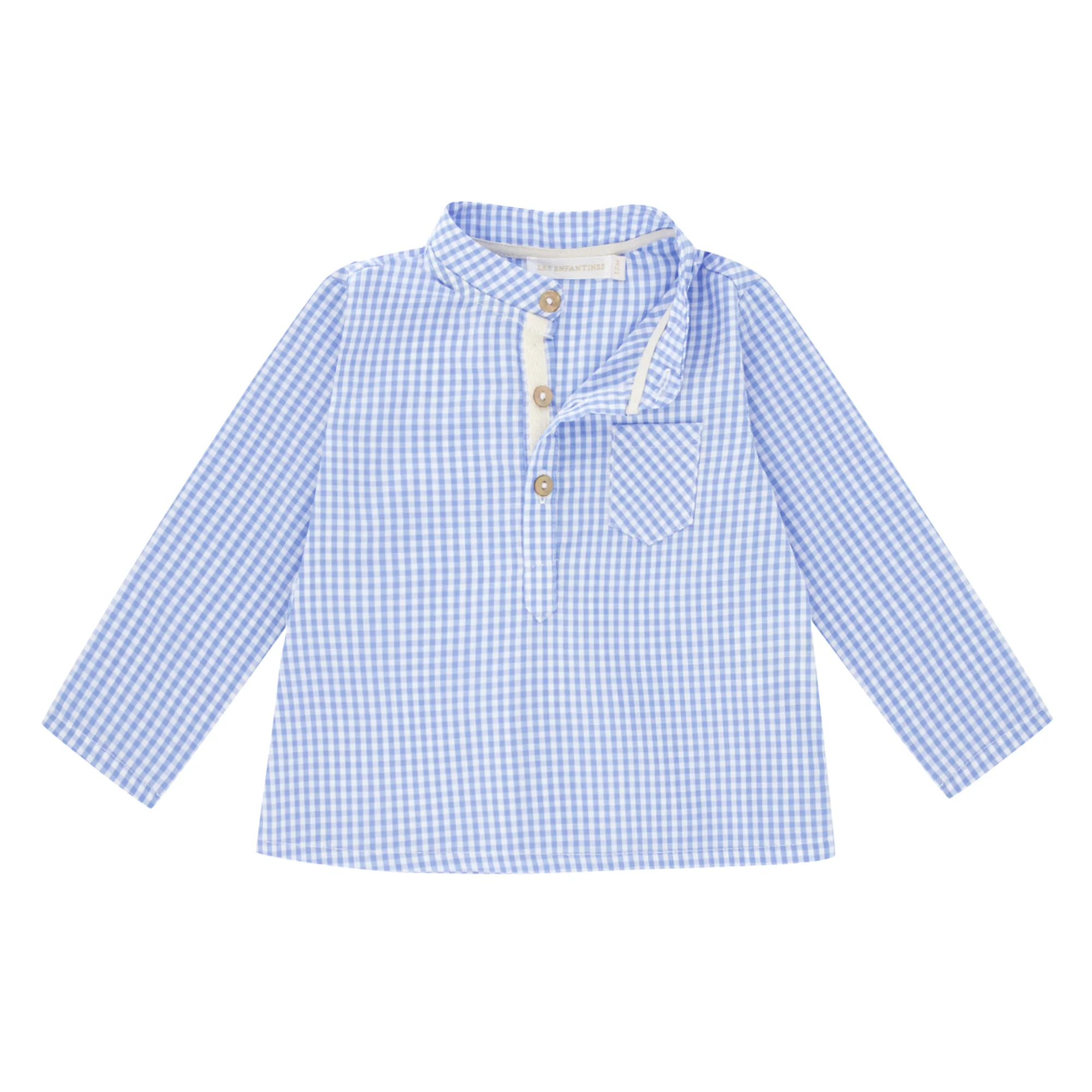 Une blouse FRELON aux manches longues en vichy bleu comme papa. Détails écru à la boutonnière. Le tissu est souple et confortable.