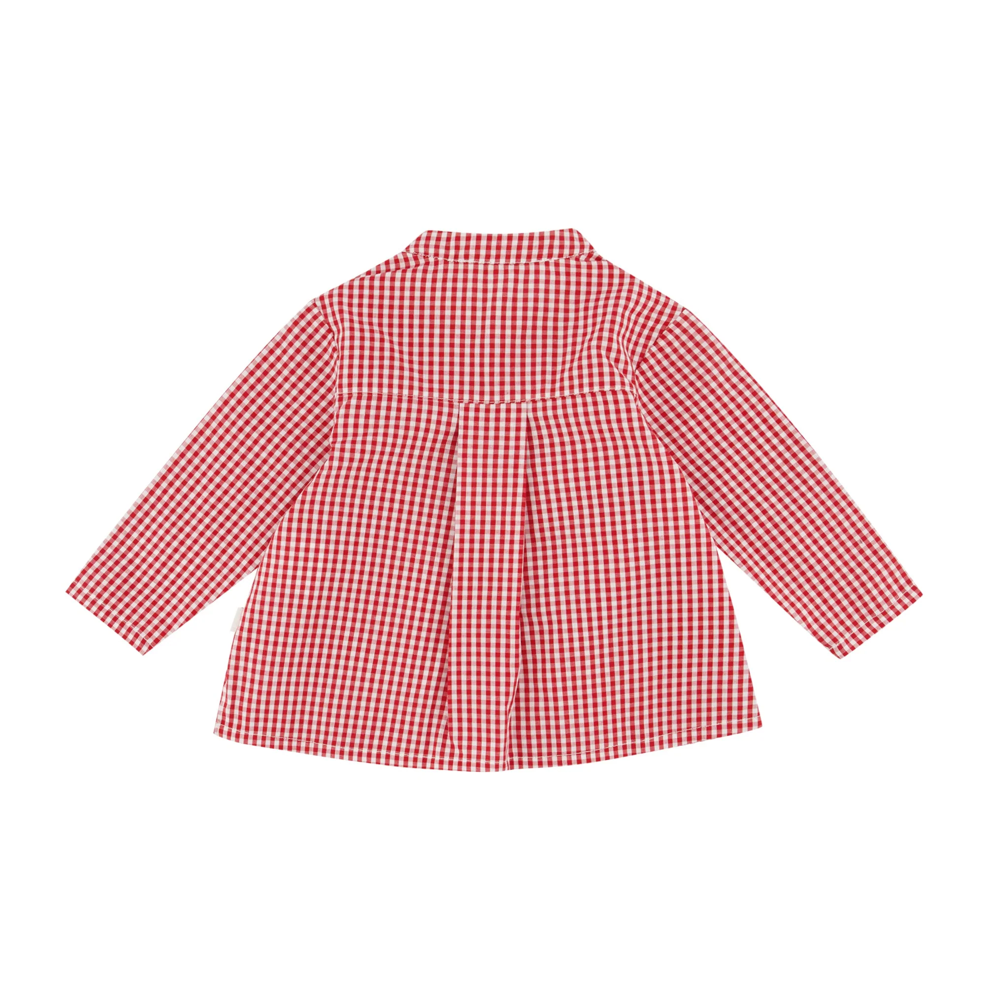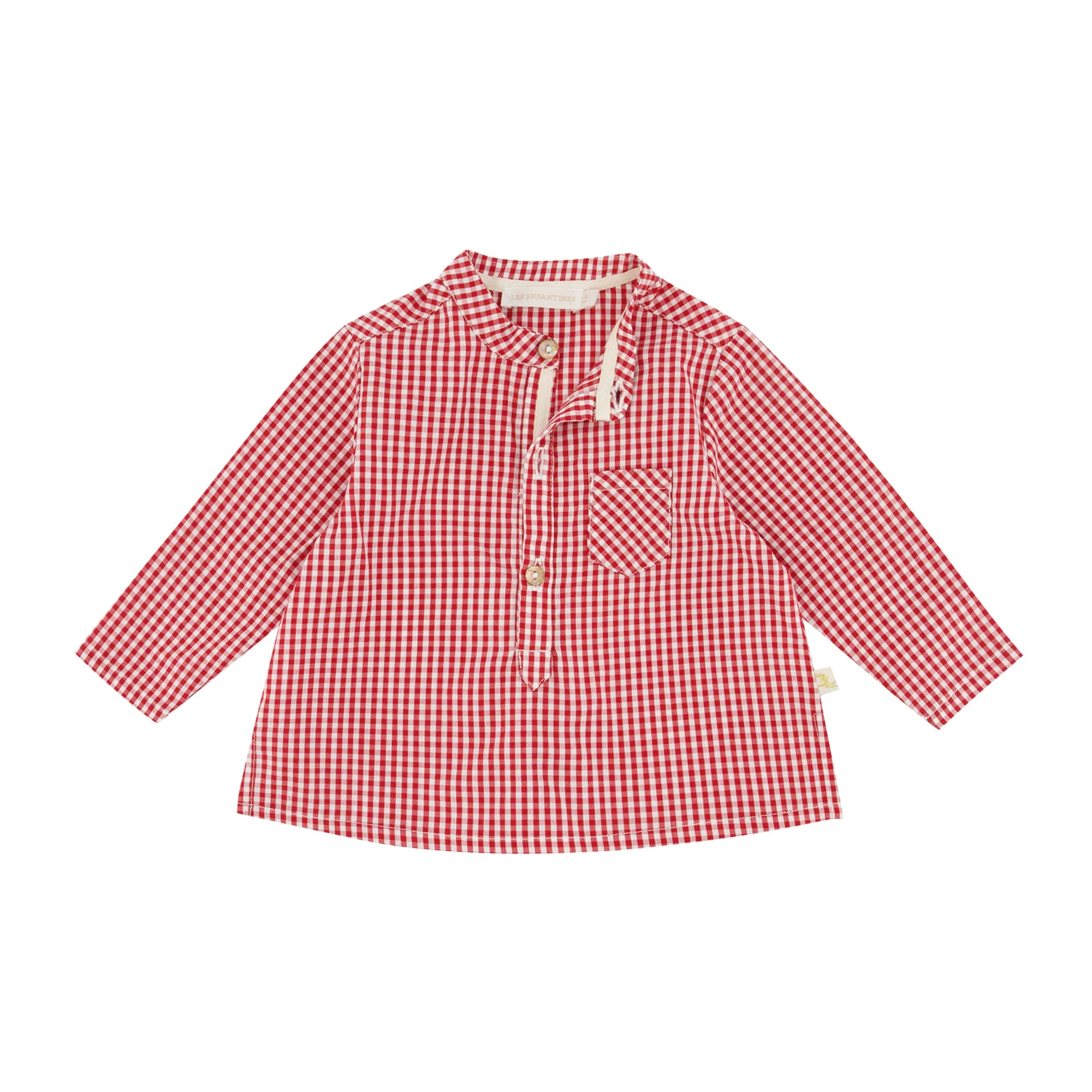 Une blouse FRELON aux manches longues en vichy rouge pivoine. Détails écru à la boutonnière. Le tissu est souple et confortable.