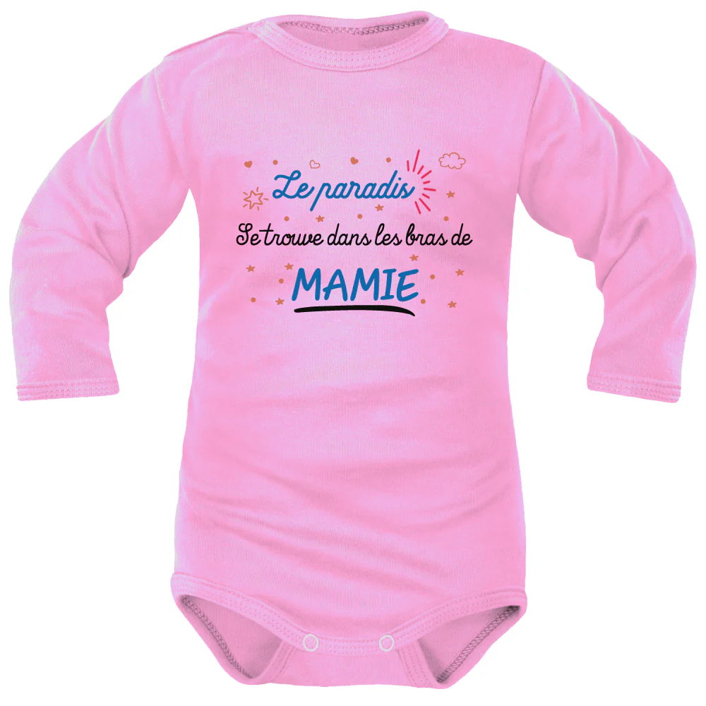 Petit cœur s’est attaché à sa belle Mamie et ne veut plus quitter ses bras. C’est qu’ils sont moelleux (et un peu mous aussi). Annoncez votre grossesse à la future Mamy ou profitez d’une occasion pour la remercier en la mentionnant sur le Body de son petit-fils/sa petite-fille miniature.