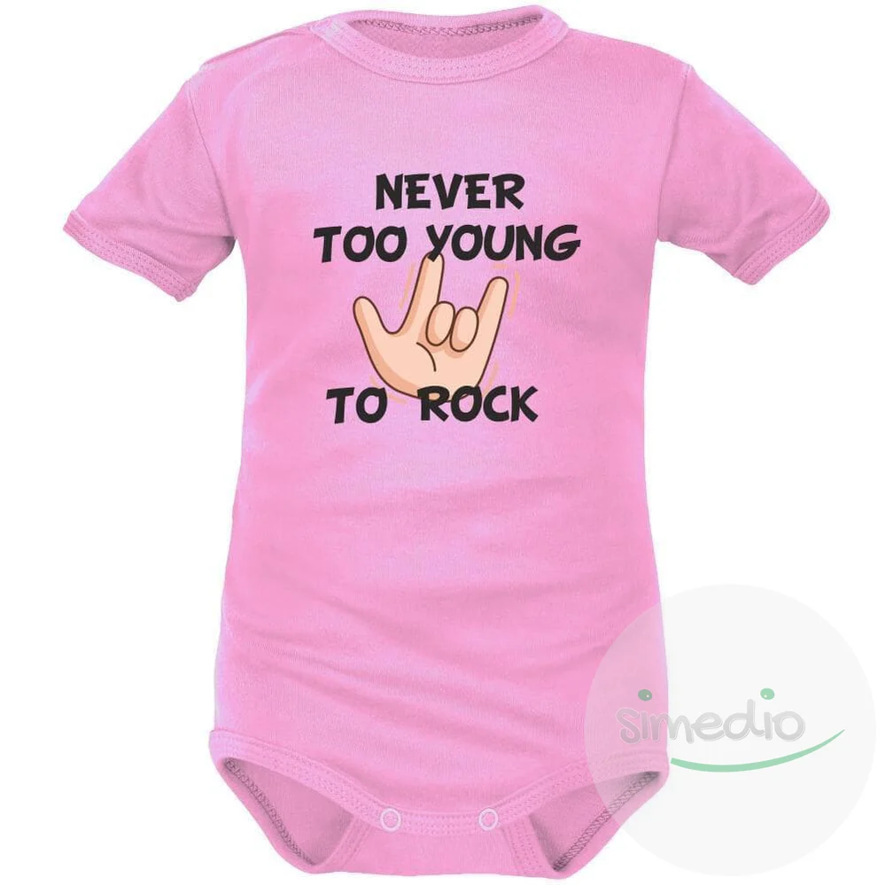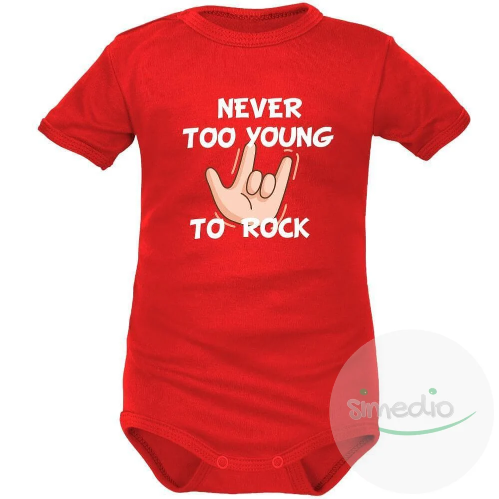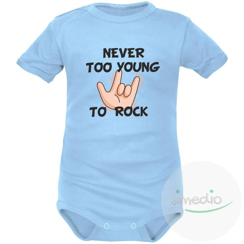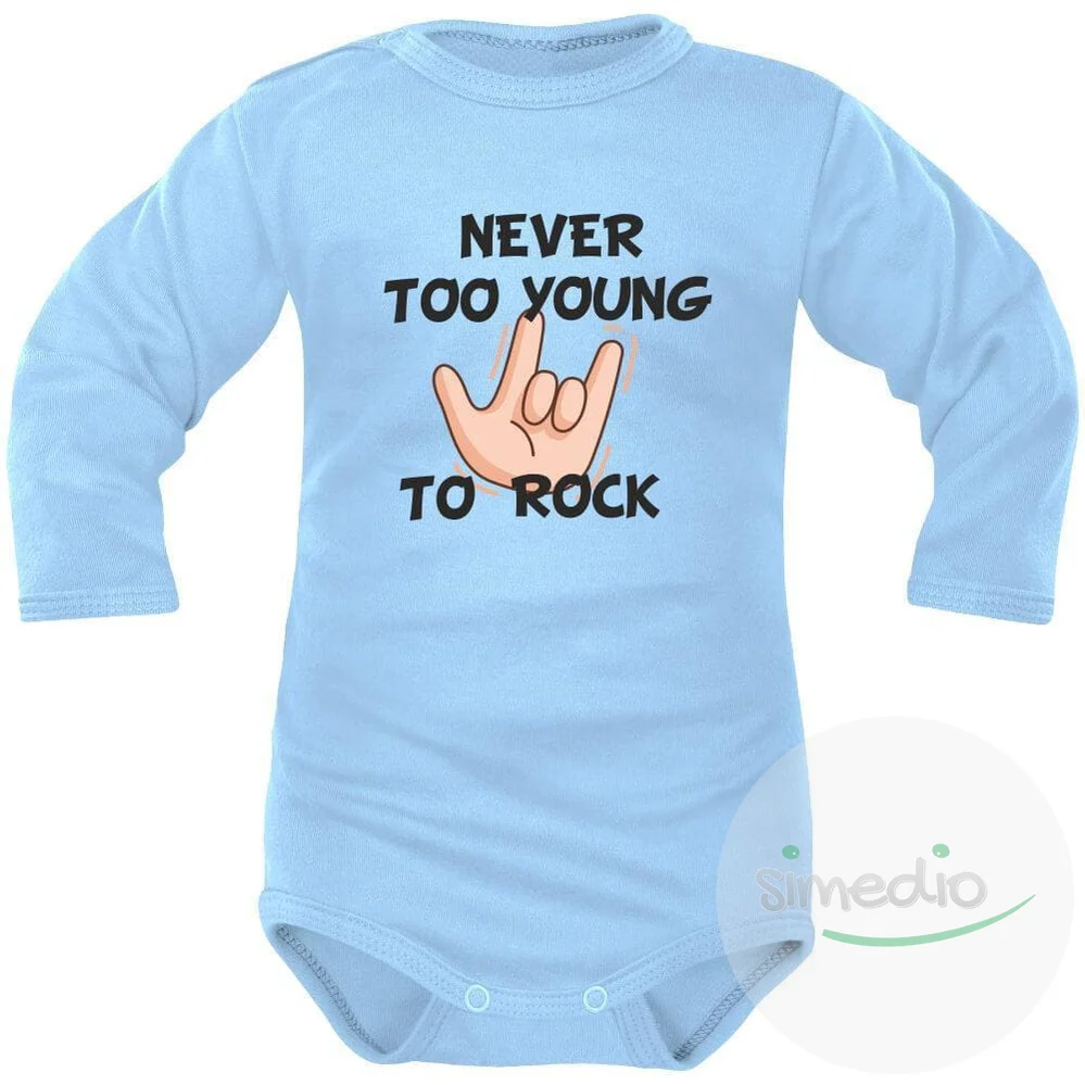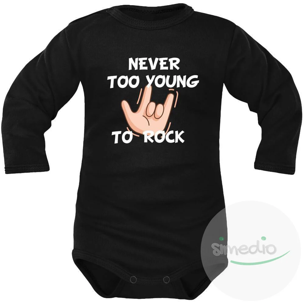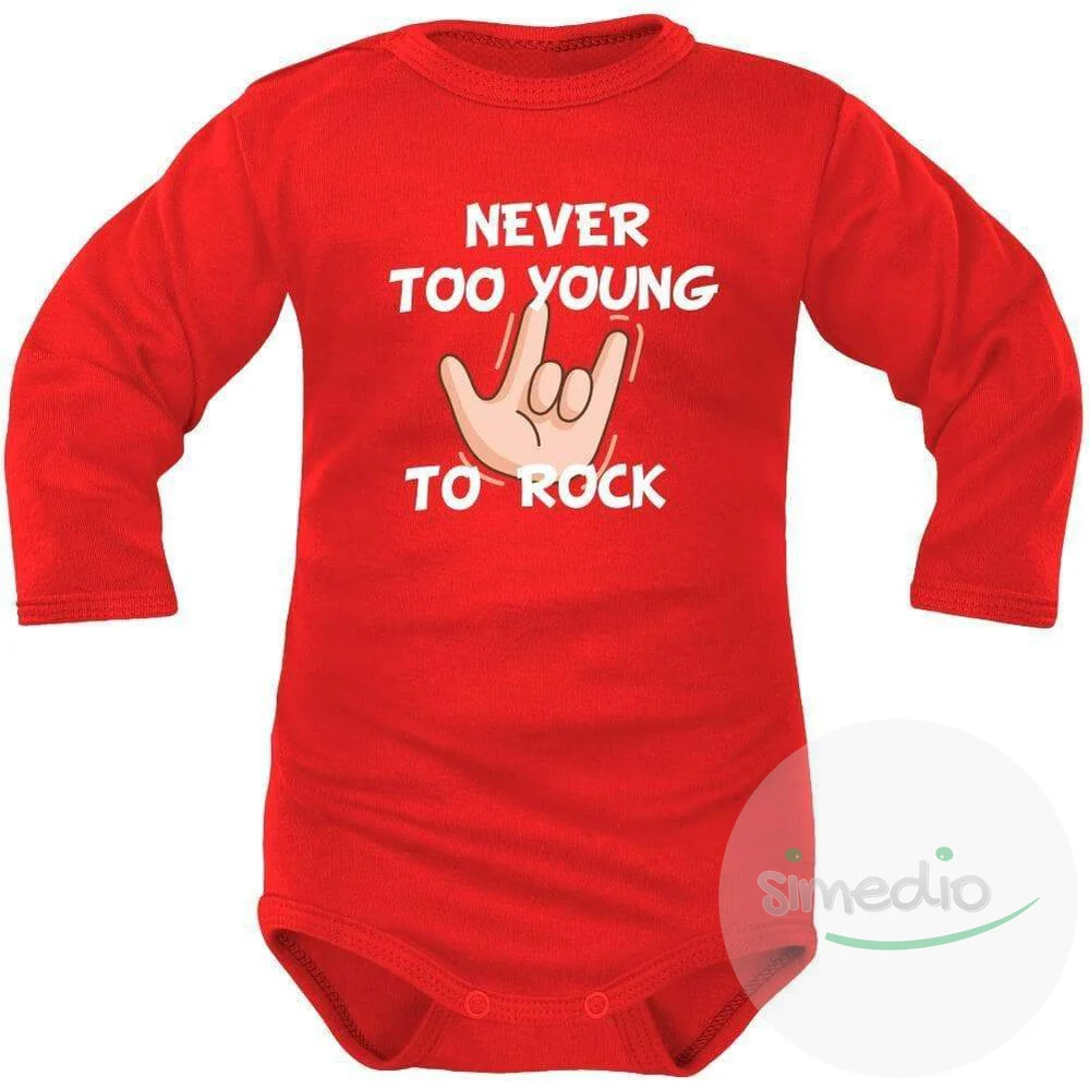 Body bébé NEVER TOO YOUNG TO ROCK, manches courtes ou longues à porter dessus ou dessous, plusieurs couleurs disponibles