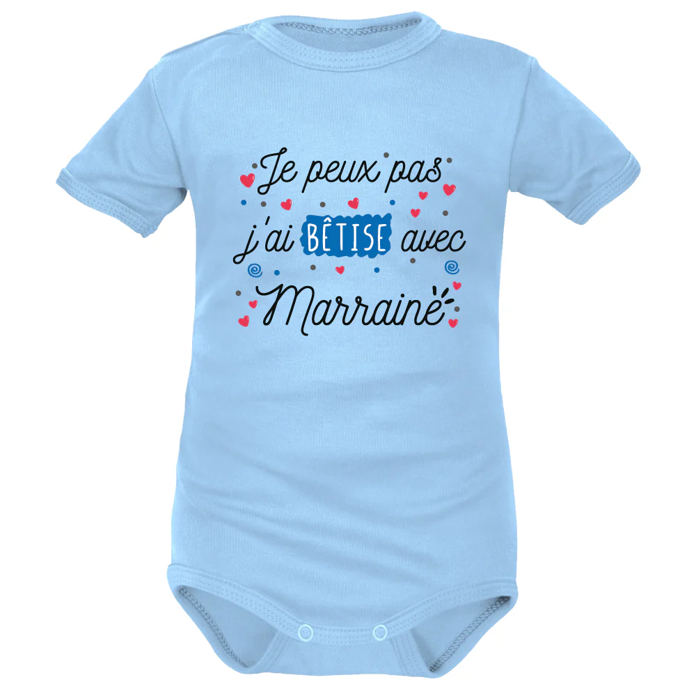 Pour offrir à la maternité, au baptême ou aux anniversaires de bébé et Marraine : Pensez au Body humour « Je peux pas, j’ai… » Une inscription indémodable pour un cadeau de naissance inoubliable. On t’aime Marraine ! Toujours plus de rire et d’émotions avec nos vêtements naissance aux slogans originaux pour Marraine.