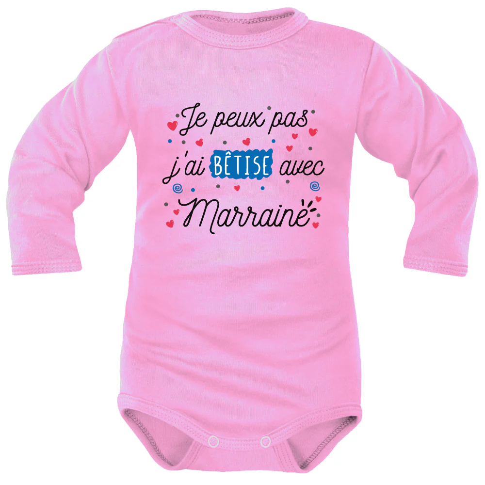 Le message marrant et impactant est sous le feu des projecteurs sur ce Body Marraine personnalisé. Le célèbre « Je peux pas, j’ai… » est mis en avant sur un lit de spirales, de cœurs et de pois roses et bleus. Les couleurs choisies sont volontairement mixtes afin de plaire au féminin comme au masculin.