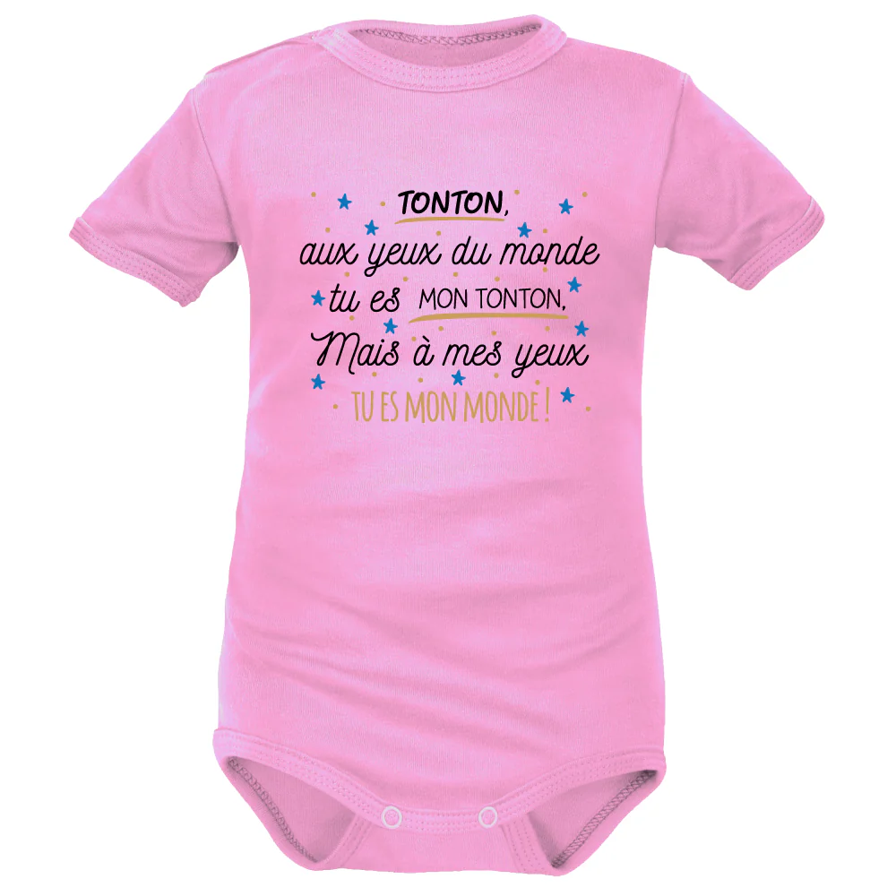 Si vous cherchez un cadeau original pour bébé : Pensez au Body imprimé Tonton. Qui écrirait un message à son Tonton… c’est bien la dernière personne à qui on pense dans cette famille. Faites l’exception et surprenez Tonton avec cette douce attention. Il sera fier et ému de voir son neveu/sa nièce habillé de ce slogan : « Aux yeux du monde tu es mon Tonton mais à mes yeux tu es mon monde »