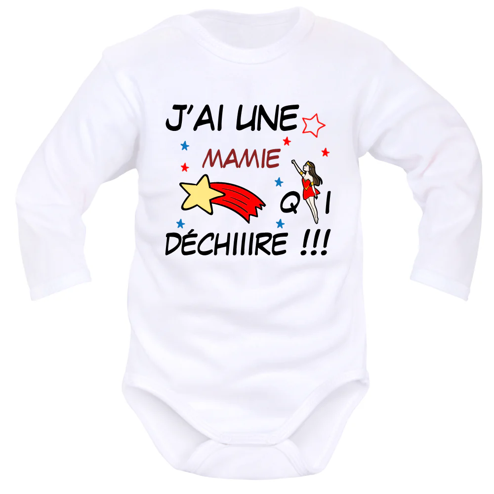 On a une Mamie super géniale claironnent ses petits-enfants. Tout le monde savait que cette femme intelligente et dynamique serait une grand-mère parfaite mais maintenant elle l’a prouvé. Attention, elle a plus d’un tour dans son sac ! Dites-lui merci et je t’aime d’une façon surprenante : Tadaam … Un Body Mamie humour trop choupi !