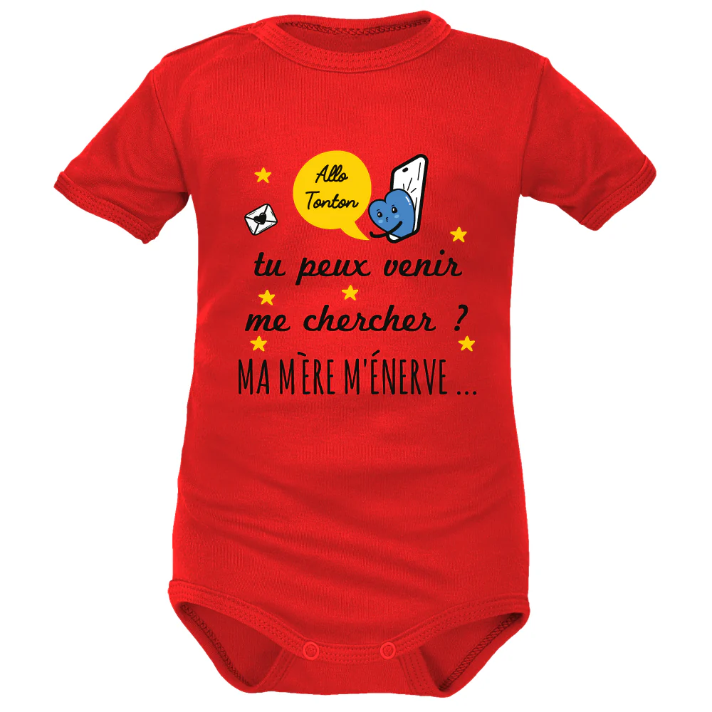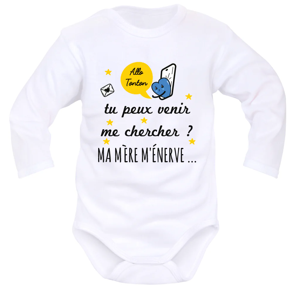 Du jaune et du bleu pour dessiner une enveloppe, des étoiles, un cœur qui parle et un téléphone portable. Voilà la scène de ce Body bébé qui illustre parfaitement le slogan drôle et gentiment provocateur « Allo Tonton… Maman m’énerve ». La mode bébé devra compter avec les Bodies à messages personnalisés : trop mignons, on se les arrache !