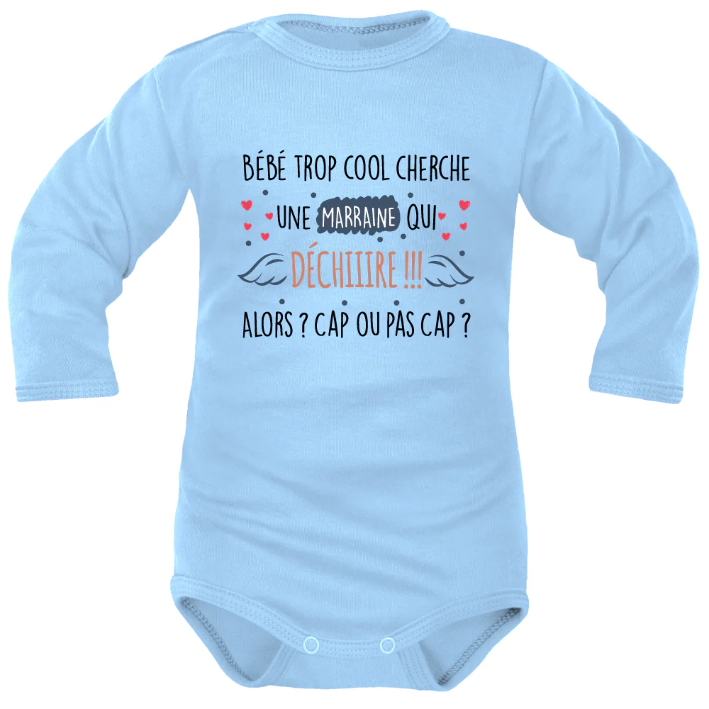 Pour lui demander « Veux-tu être ma Marraine de façon personnalisée : Foncez sur ce Body imprimé, illustré et coloré. A glisser dans un coffret/une box demande Marraine ou à offrir comme cadeau principal à l’élue de votre cœur. Un cadeau sentimental et symbolique à commander en ligne : Faites le plein d’émotions. Alors ma belle Marraine, cap ou pas cap ?