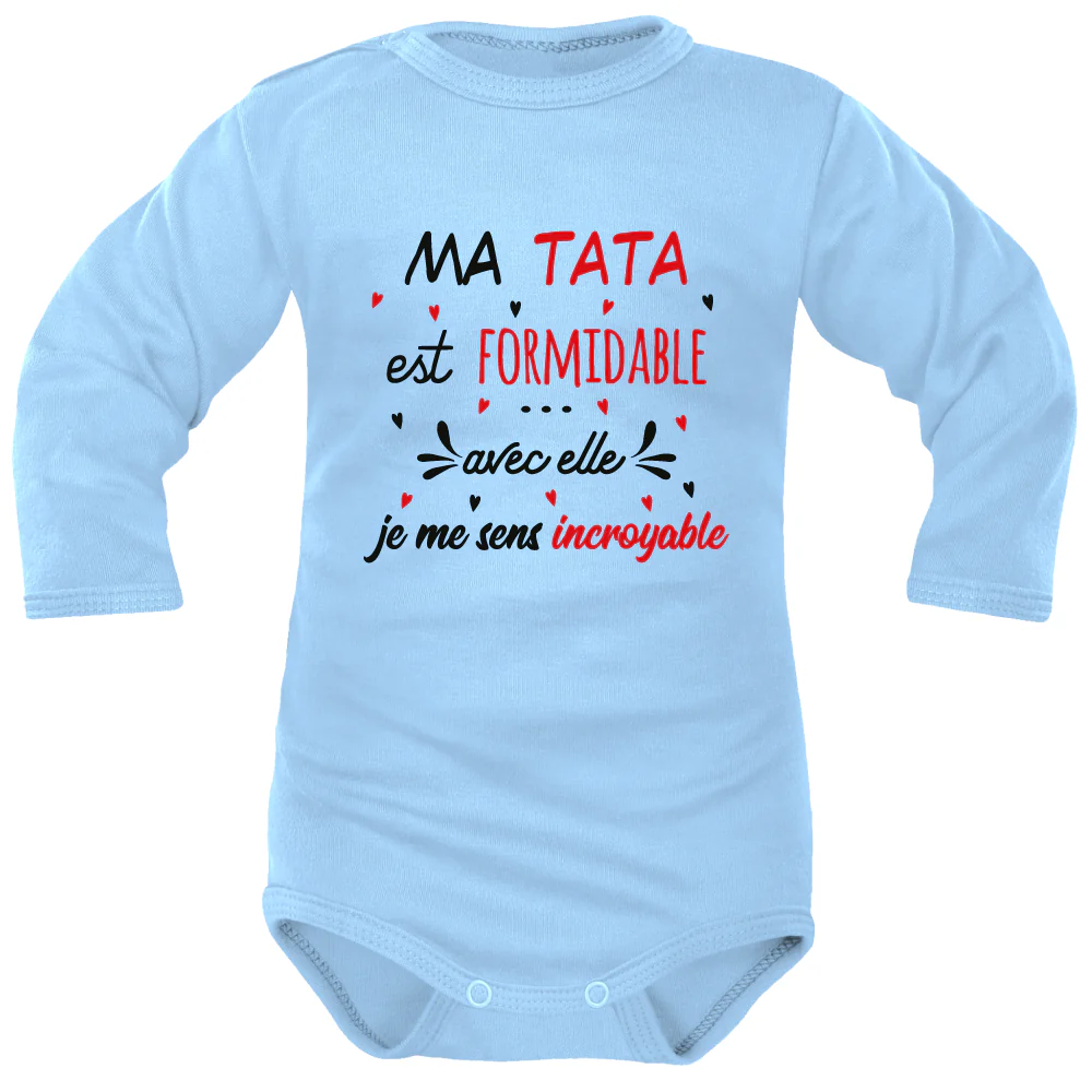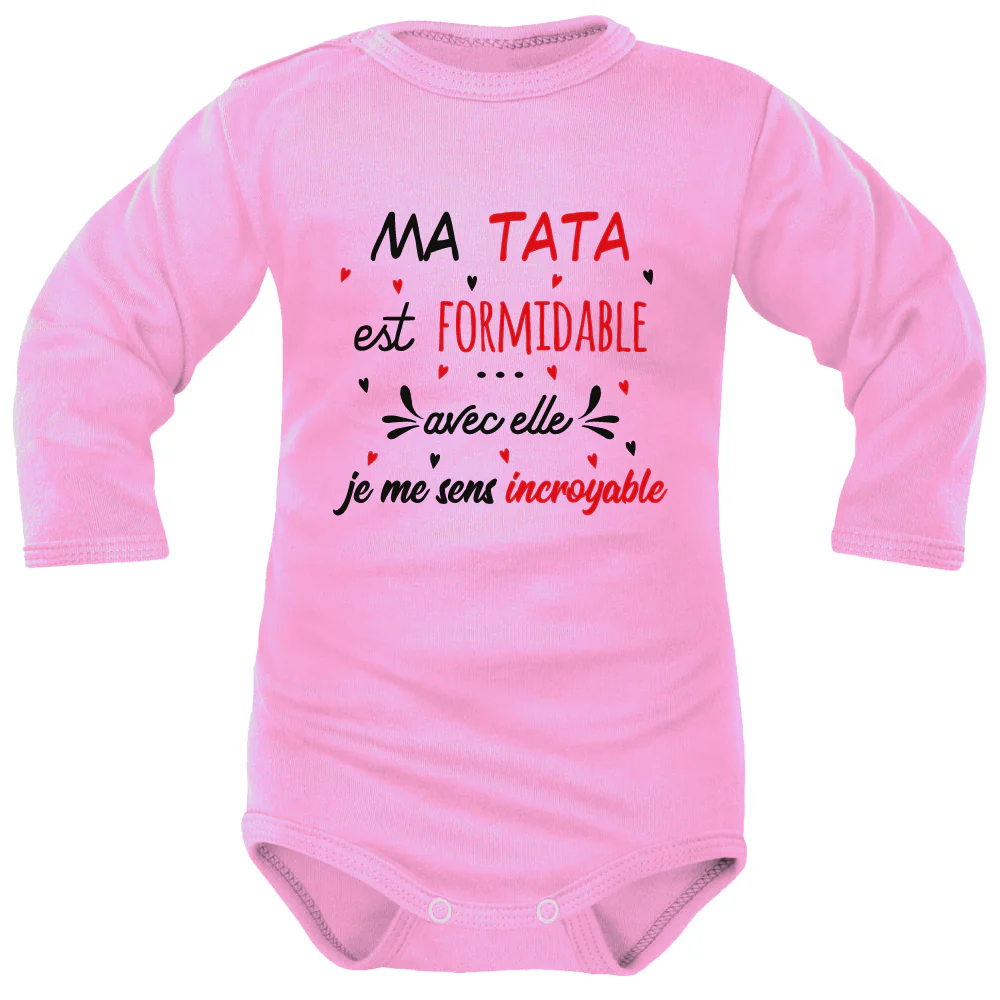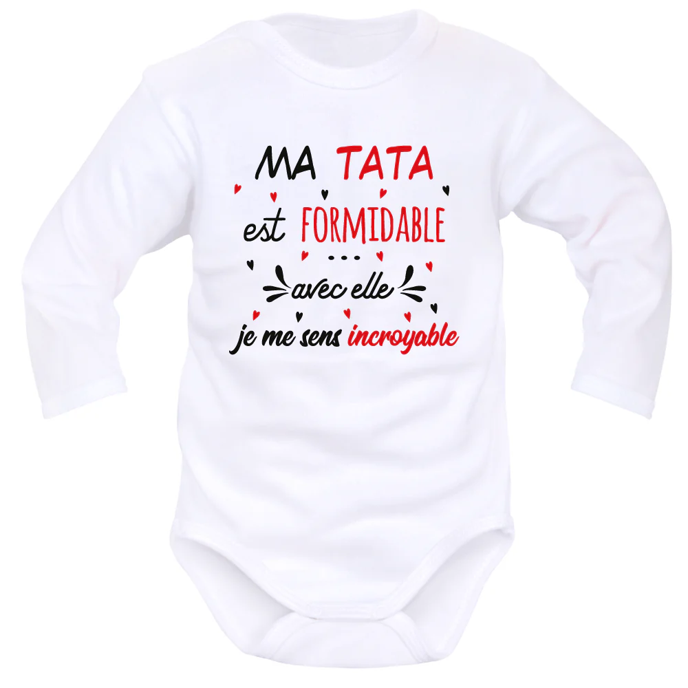 Donnez-moi un T.A.T.I.E pour Tatie ! Claironne sa petite nièce adorée. C’est la Tata préférée de la famille : Elle a un cœur en or et des bras toujours grands ouverts. Ses neveux, plus grands, se délectent de discuter avec elle, alors que le petit dernier porte fièrement son Body Tata à cœurs. Il pleure… lui aussi réclame la compagnie de Tatie.
