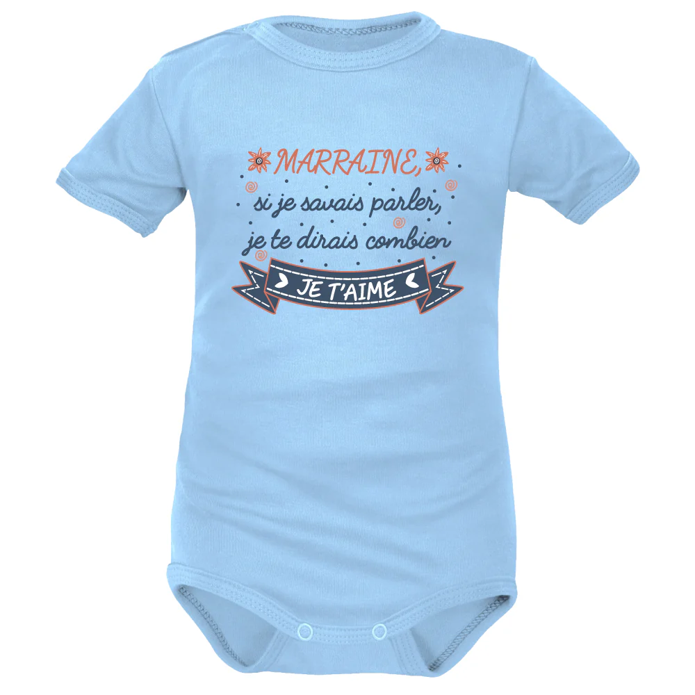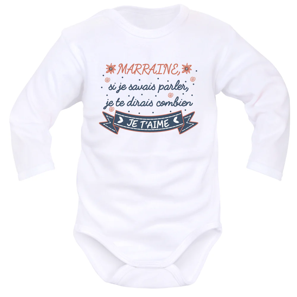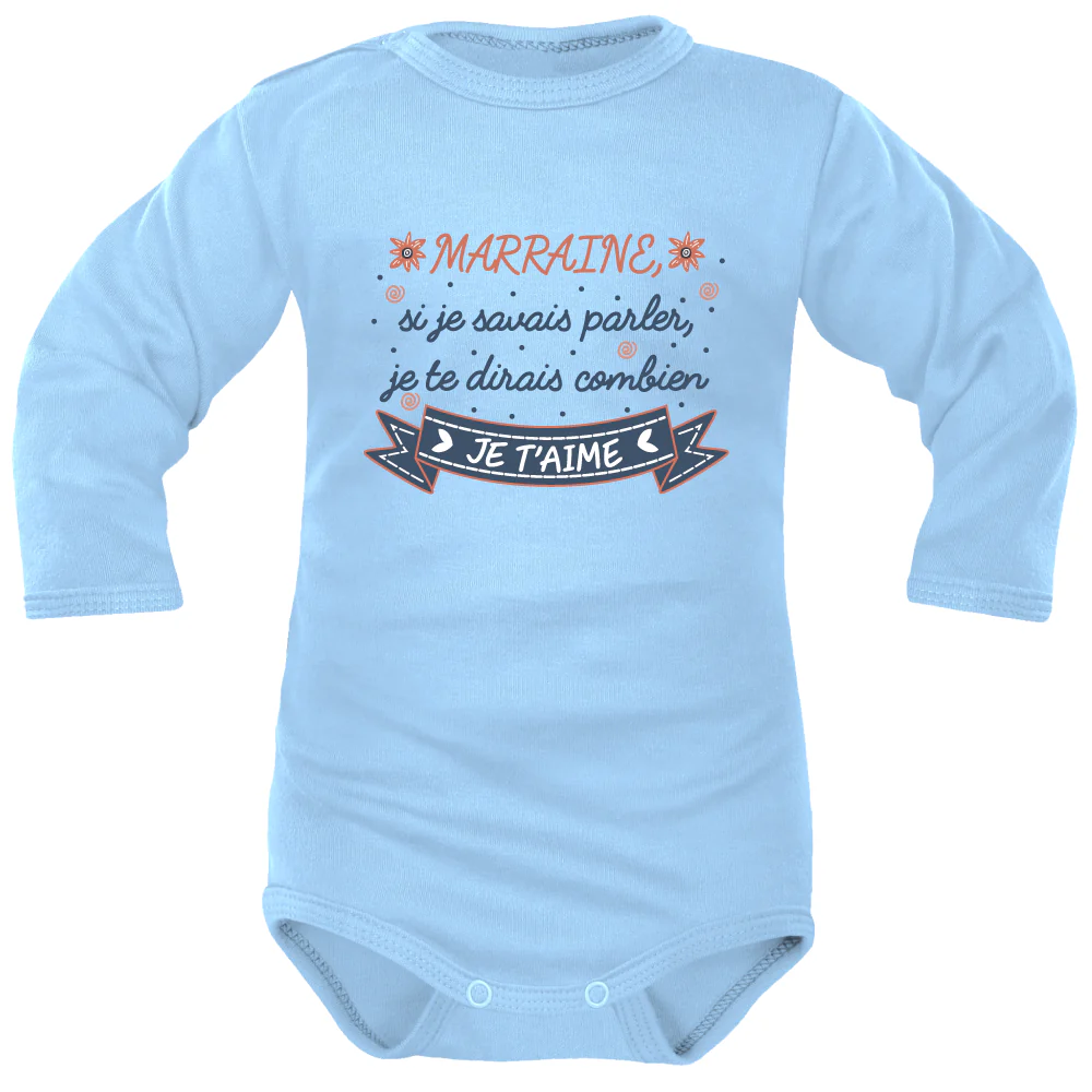 Pas besoin d’une occasion particulière pour faire le bonheur de Marraine, bébé ou de ses parents. Les petites attentions du quotidien forment les montagnes d’amour de demain. Si vous êtes plus traditionnel, réservez-vous un Body “Je t’aime Marraine” pour demander à une proche de devenir Marraine ou pour offrir lors d’une naissance, baby shower, fête familiale ou anniversaire. Envie de voir plus de modèles Marraine ? Montez dans le train coloré des bodies Marraine drôles et personnalisés. Un voyage à ne pas manquer !