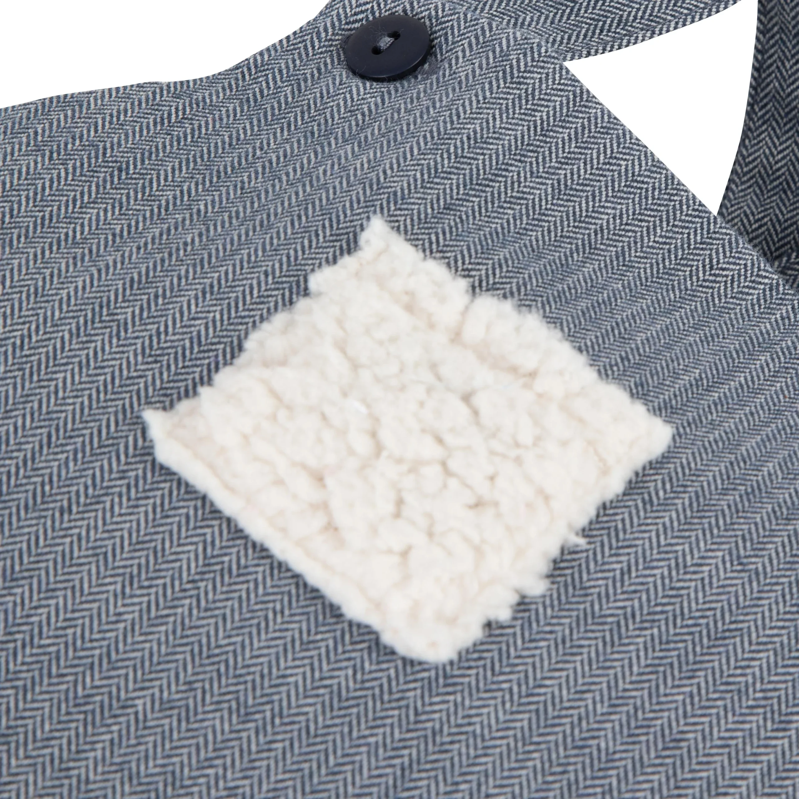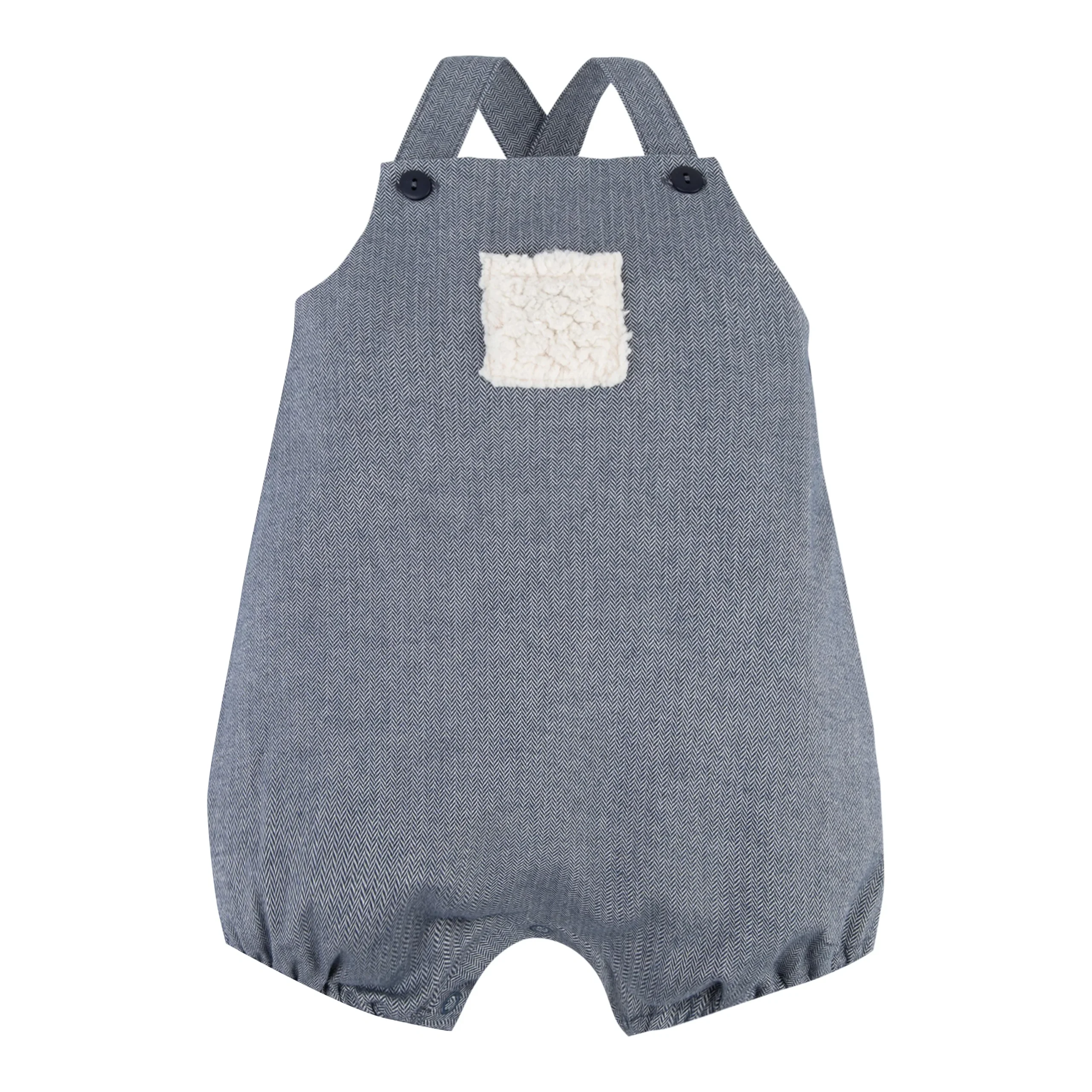 Elle est en joli coton tout doux, souple et bleu marine avec des boutons assortis et une poche en moumoute sur le devant pour le petit détail craquant.