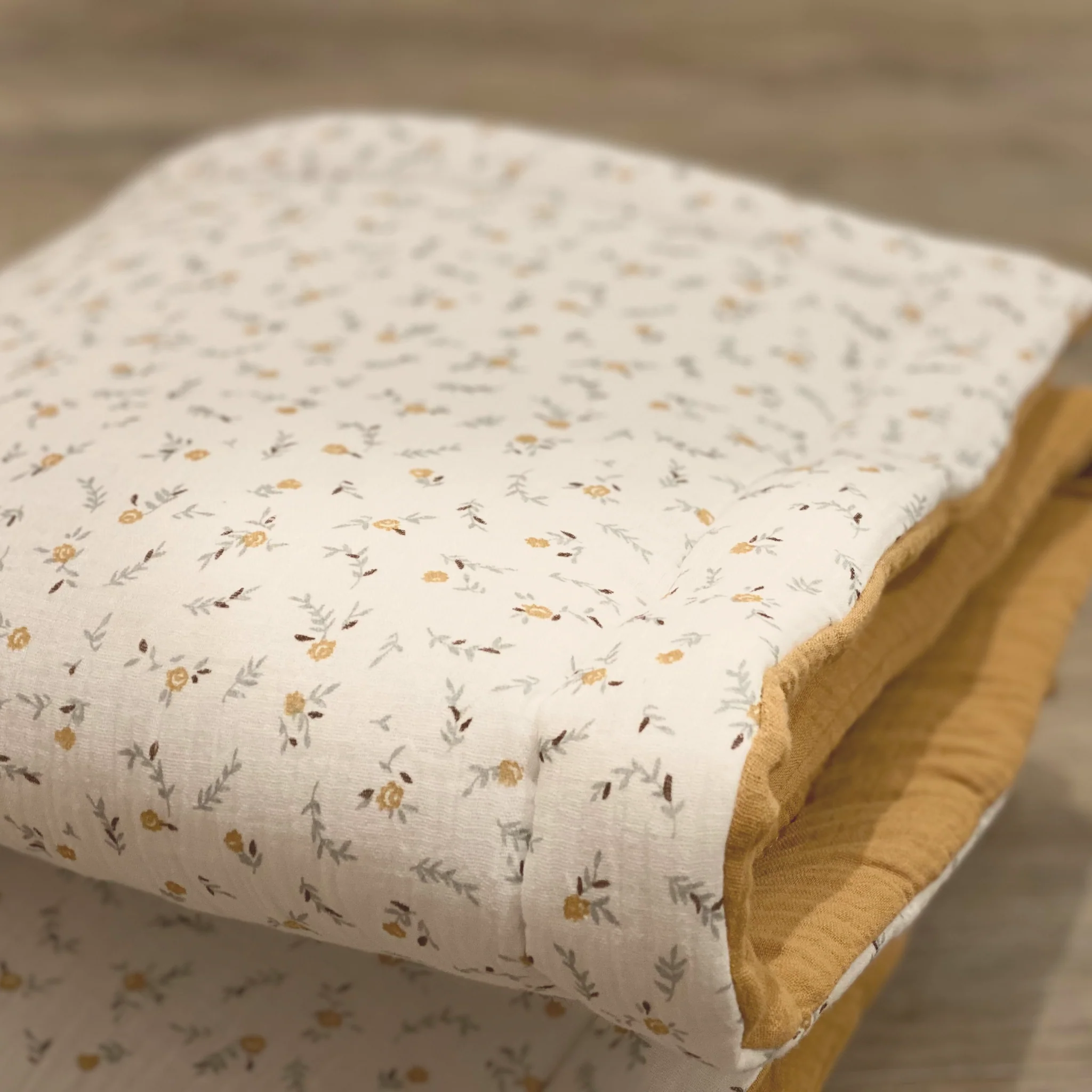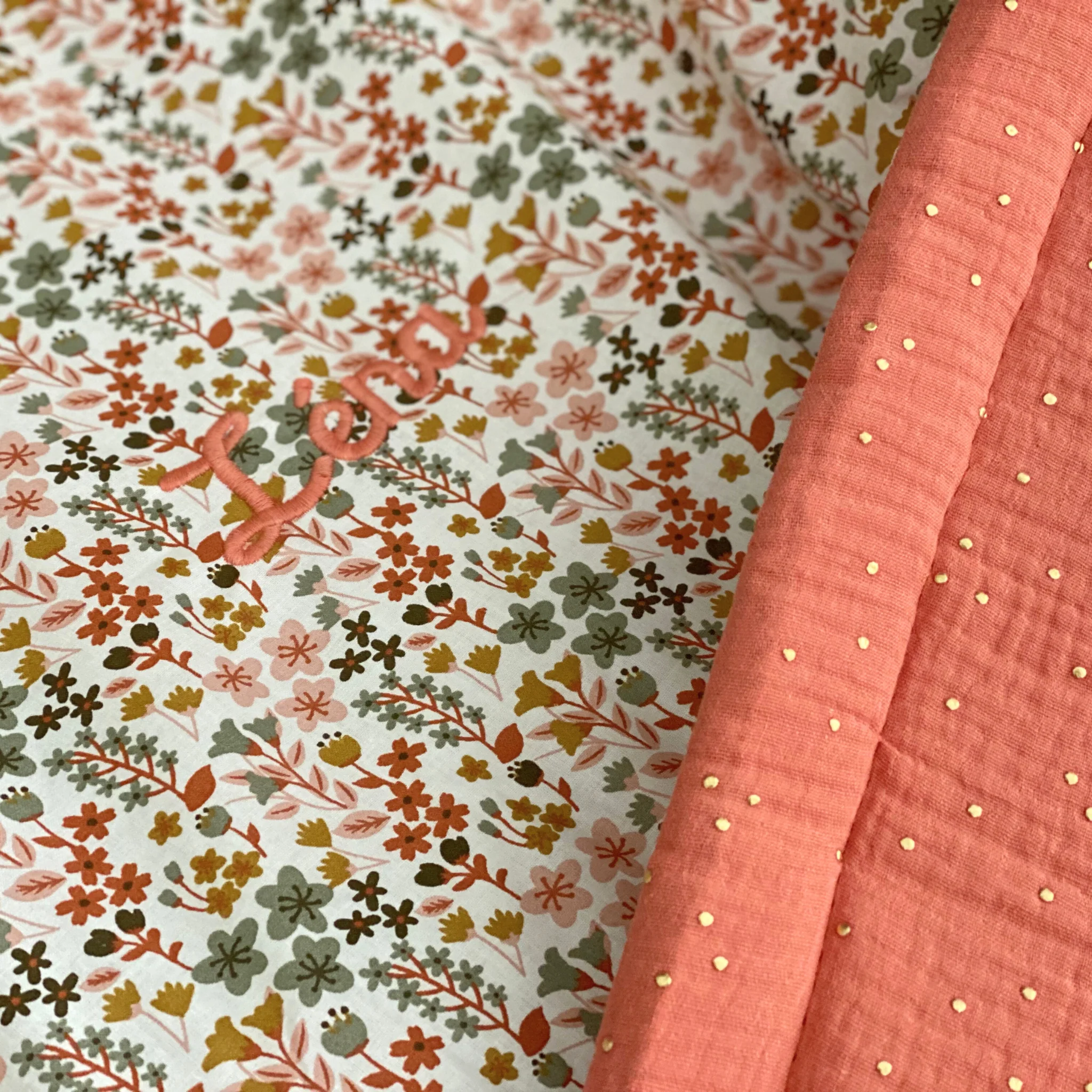 1 face en coton Oeko tex motif fleurs et un face en gaze de coton rose, vert , camel ou terracotta à pois dorés au choix. À sélectionner dans les options.