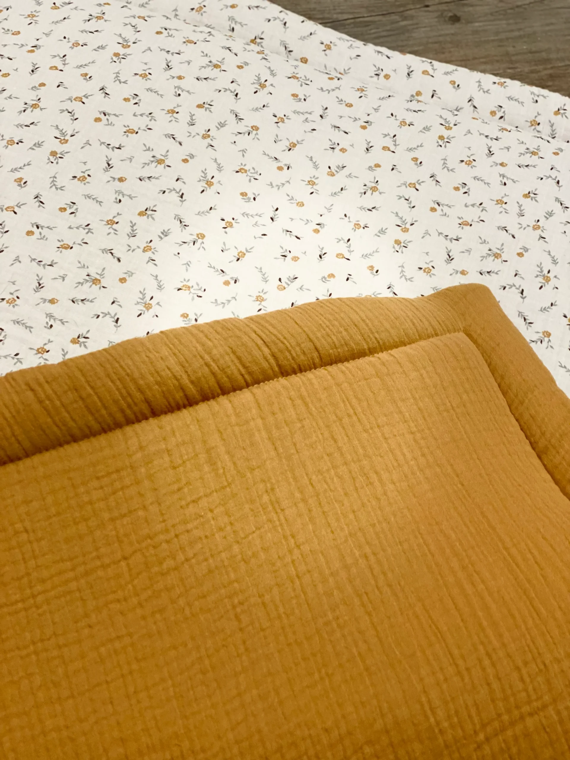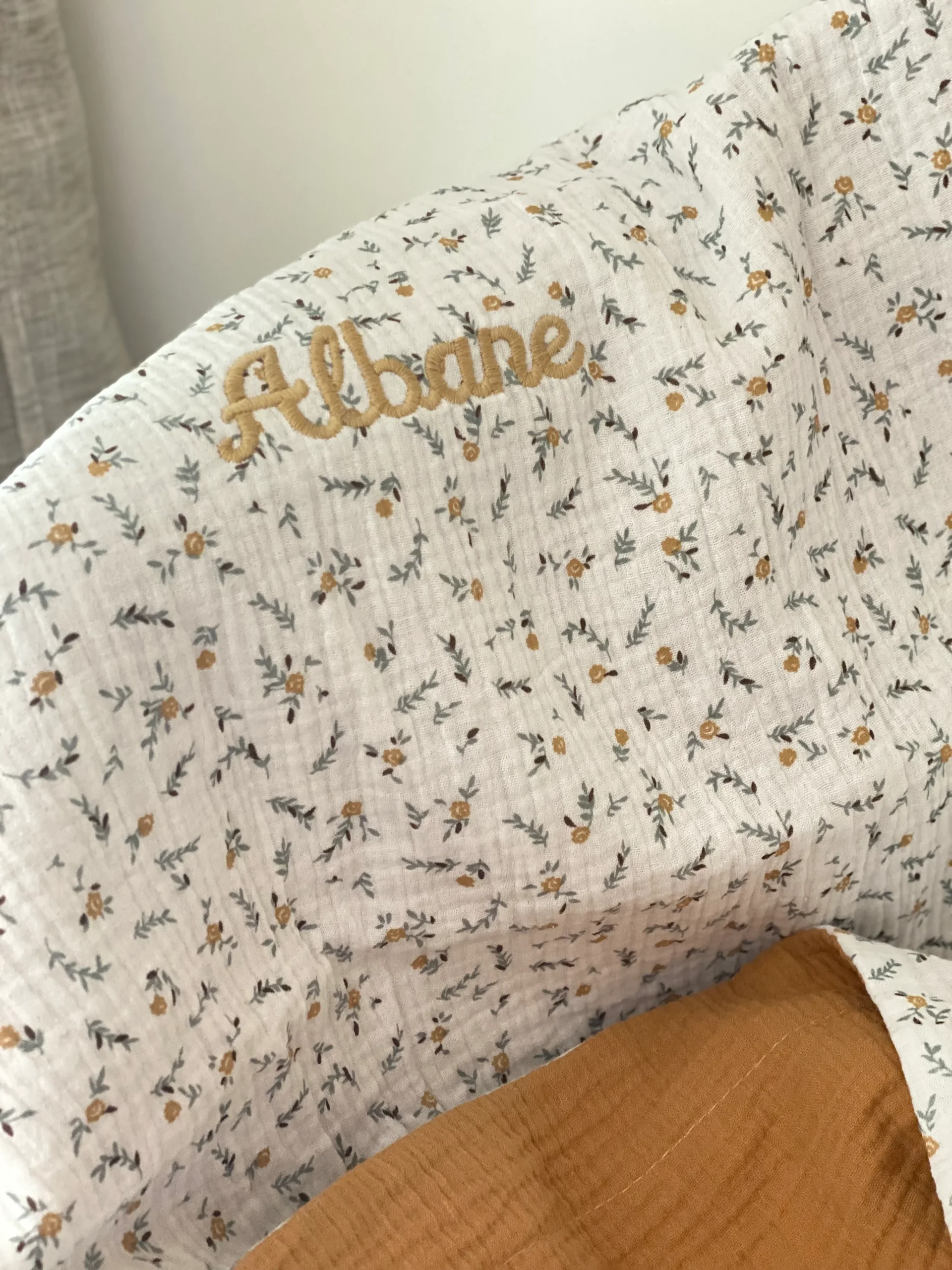 1 face en gaze de coton motif fleurs et un face en gaze de coton unie camel ou vert de gris au choix. À sélectionner dans les options.