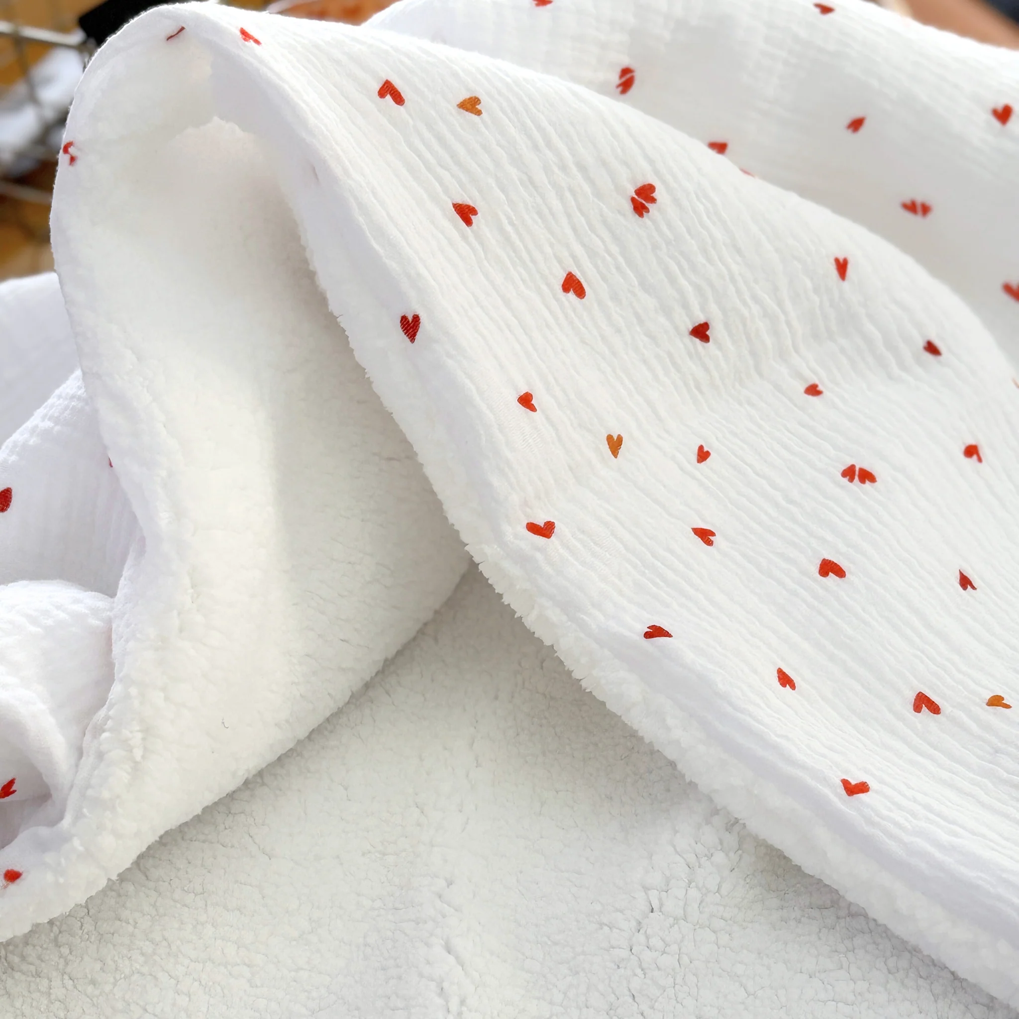 On craque pour cette magnifique couverture fait main et personnalisable en gaze de coton « Petits coeurs » qui enveloppera bébé de chaleur pour de gros dodos tout doux !