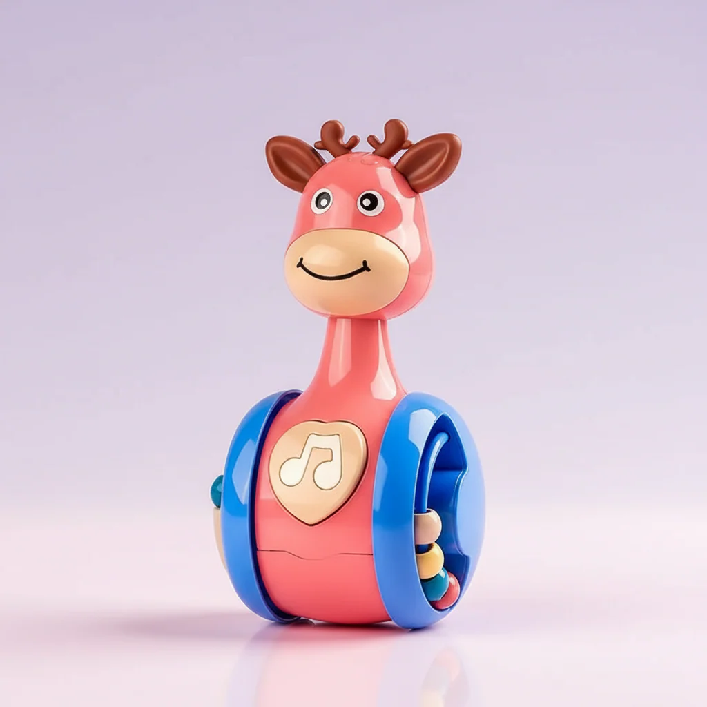 Culbuto girafe musicale pour bébé 6-18 mois. Jouet à pousser avec roue transparente contenant billes colorées. Encourage, ramper et marcher. Développe motricité globale, coordination et cause à effet. Plastique ABS sans BPA, certifié CE. Dimensions 15 x 6 x 6 cm, poids 131g. 2 couleurs : Rose et Bleu. Parfait pour l’éveil sensoriel et les premiers déplacements.