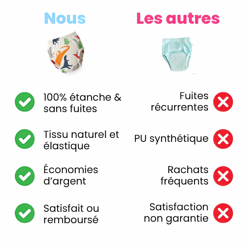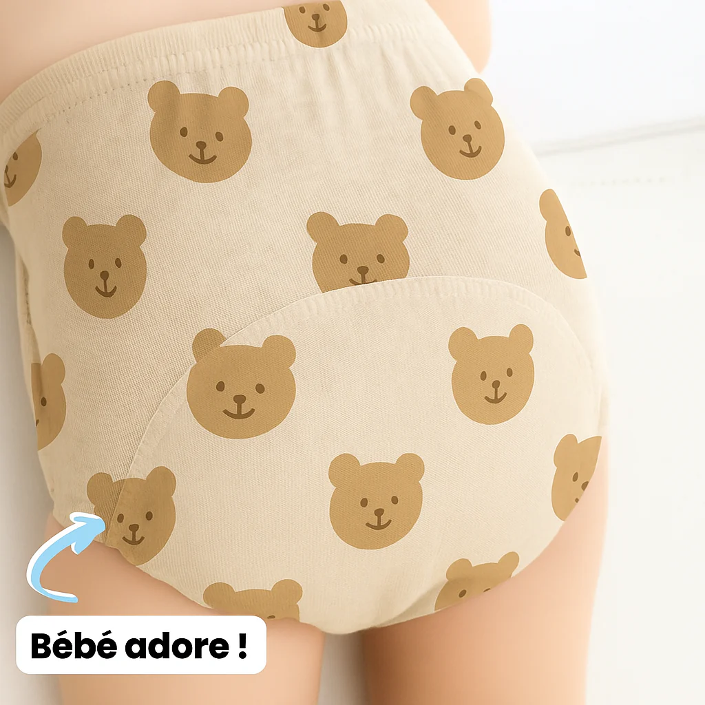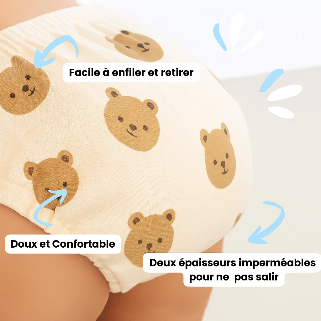Si votre enfant est encore habitué aux couches classiques, il n’a pas encore le réflexe de se rendre aux toilettes. Cette culotte éducative change la donne : elle laisse une sensation d’humidité lorsqu’un accident se produit. Grâce à sa barrière imperméable, elle empêche toute fuite sur les vêtements ou les draps, tout en favorisant l’apprentissage naturel.