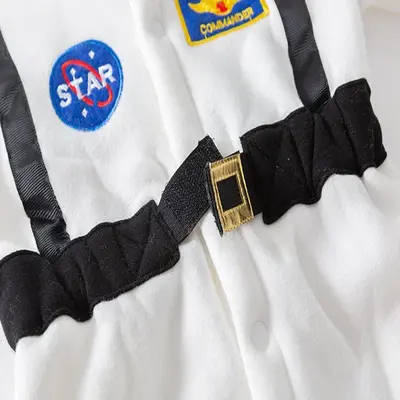 Disponible en orange et blanc, ce costume est agrémenté d’écussons de mission spatiale et d’une ceinture décorative pour un rendu professionnel.