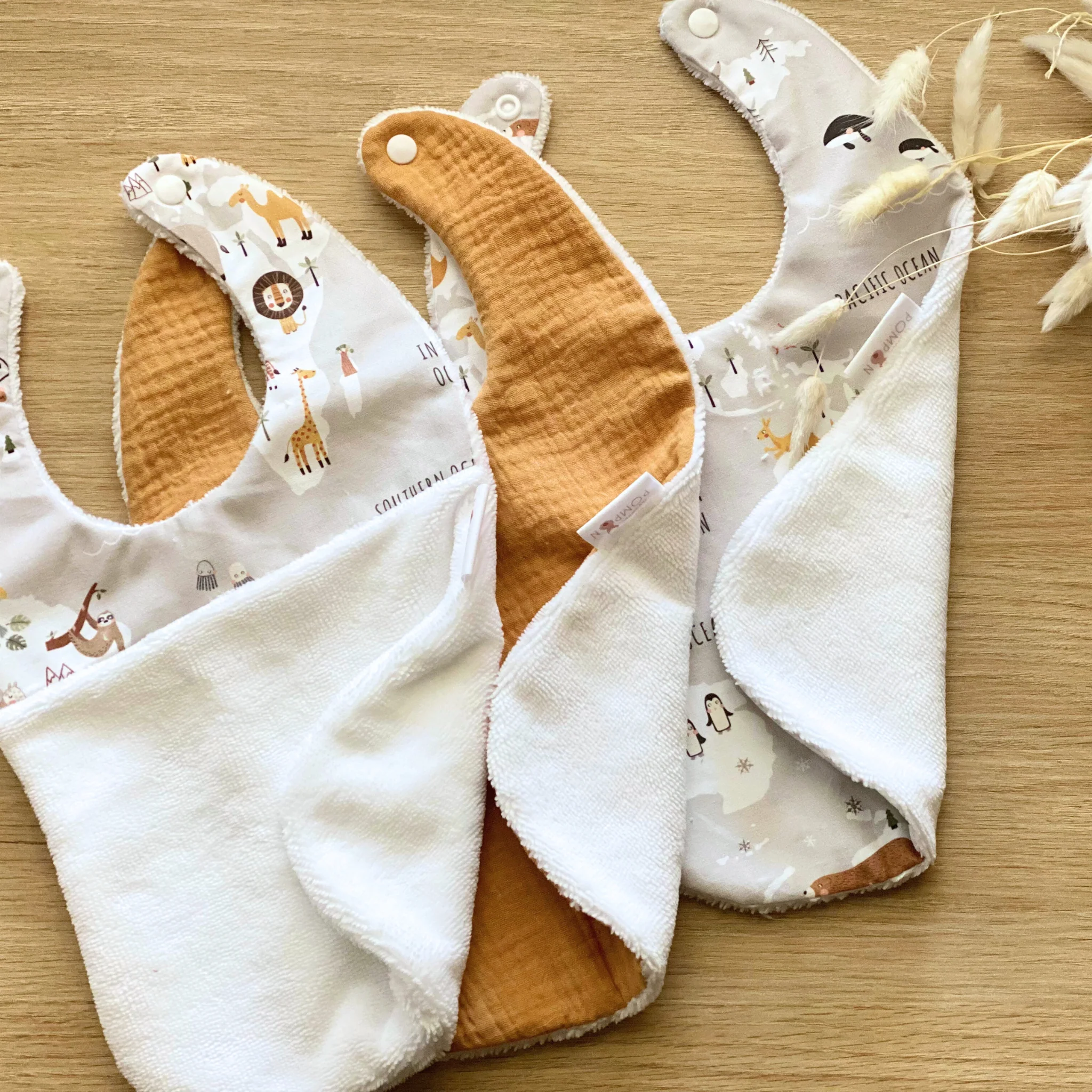 Face avant en coton Oeko tex à motifs animaux sur fond gris clair et gaze de coton camel et face arrière en éponge de bambou blanche.
