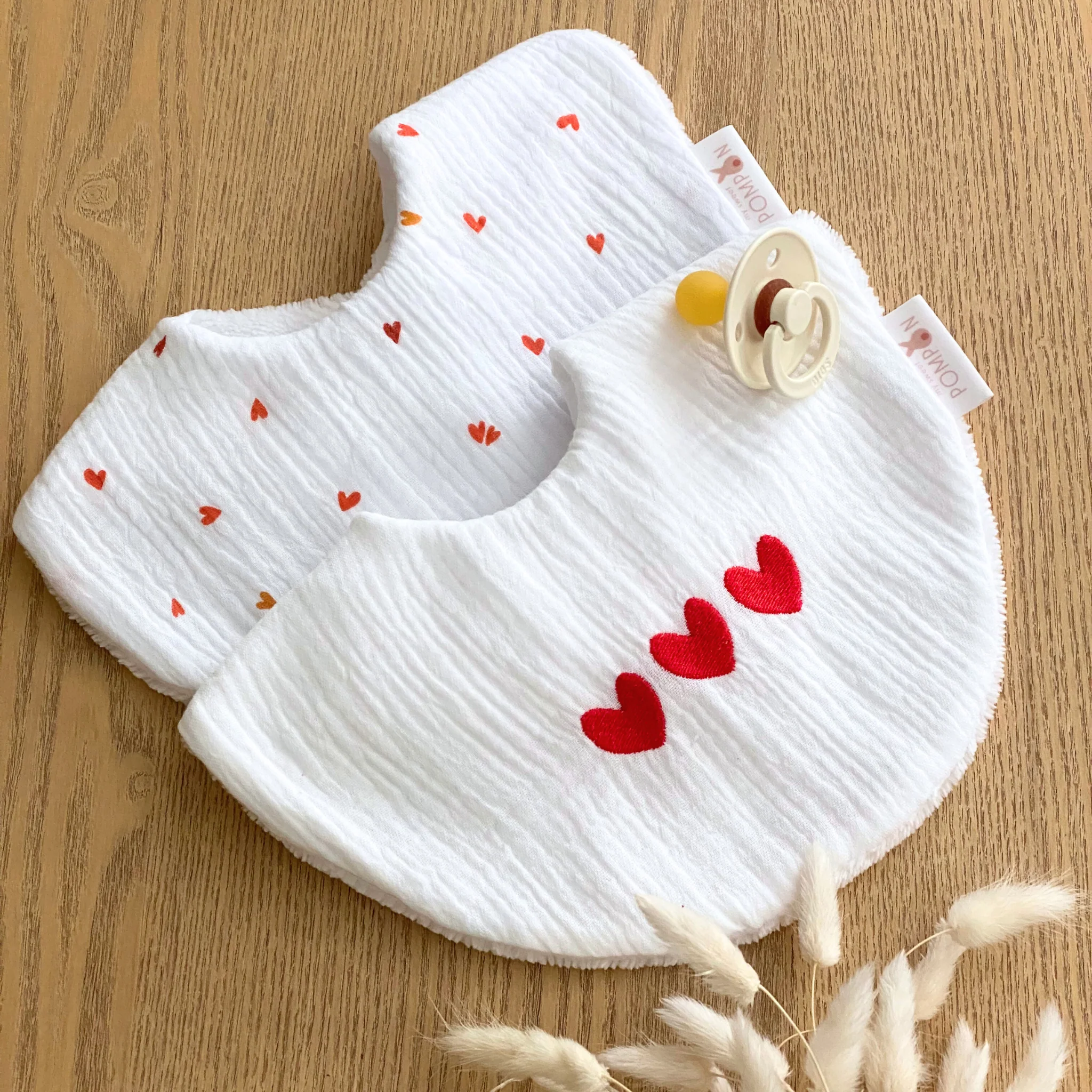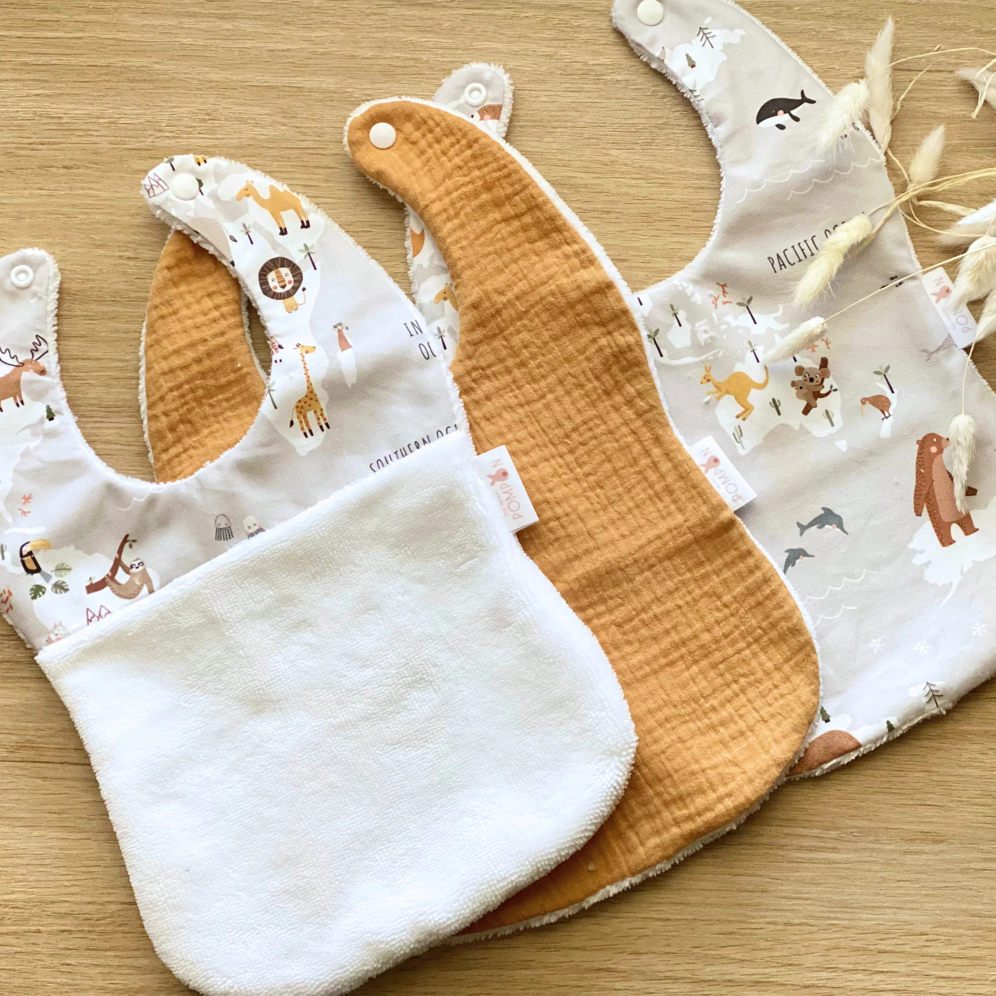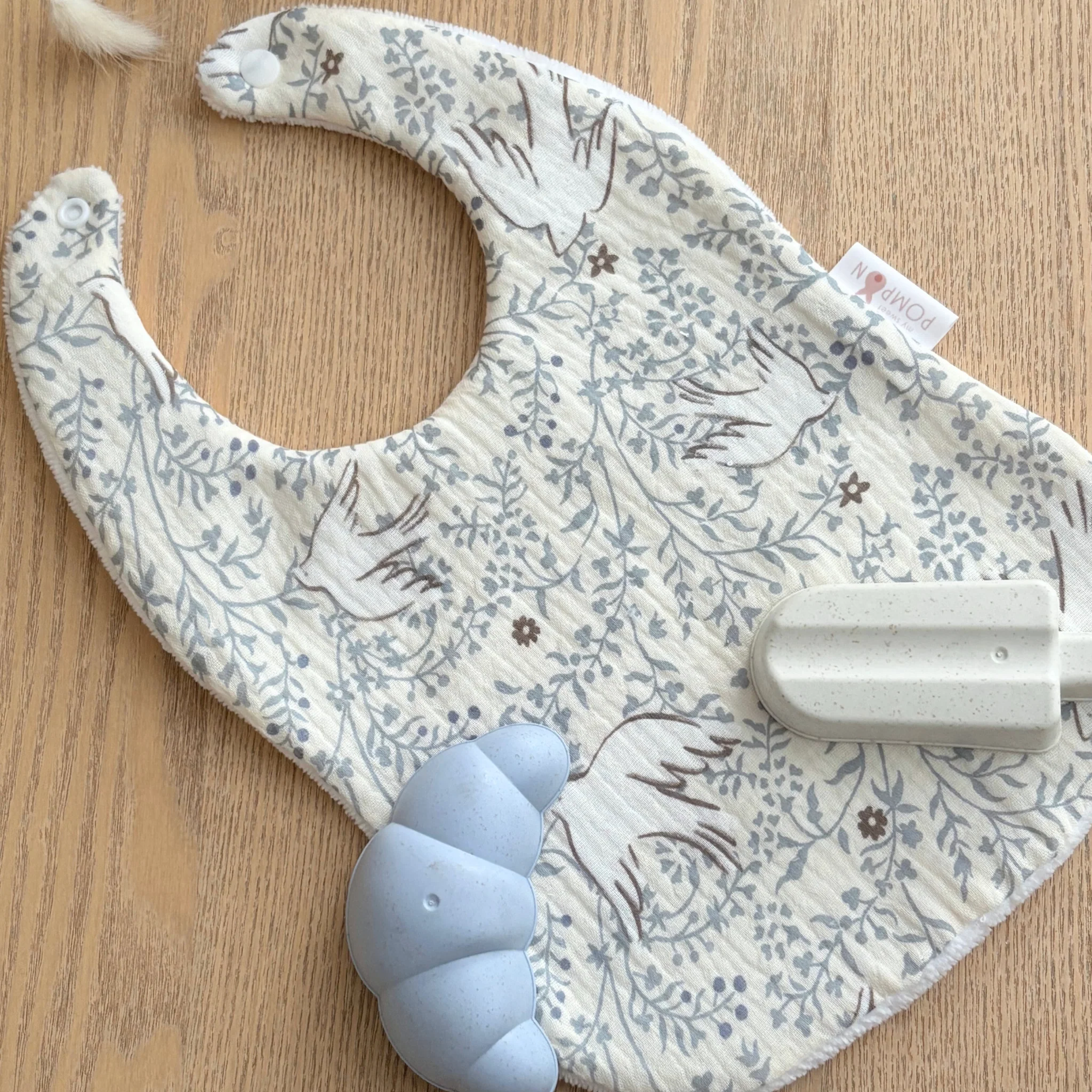 On craque pour ces grands bavoirs pour bébé en gaze de coton écru et bleu tout doux ! Un incontournable du trousseau bébé qui sera utilisé sans relâche tout au long de la journée.