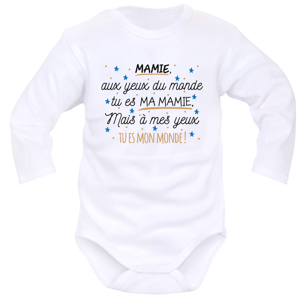 Mamie est bien plus importante que ce qu’elle pourrait penser. Elle incarne la sagesse, la générosité, l’amour inconditionnel et la disponibilité. Dites « merci Mamie », « je t’aime Mamy » en habillant bébé d’un super Body à inscription Mamie. Elle sera surprise et émue par ce cadeau sentimental incroyable.