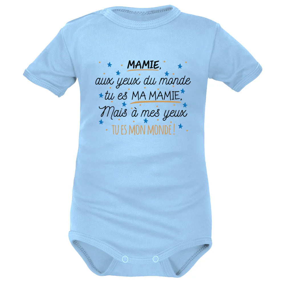 Aucun bébé n’est mis de côté : chacun a le droit de se parer d’un Body à inscription Mamy trop mignon. Le slogan affectueux envers Mamy insiste sur le mot « monde » avec un petit jeu de mots à croquer. Les couleurs bleu et brun subtiles semblent couvrir bébé de tendresse et de douceur même si le tissu 100 % coton fait déjà largement son job.