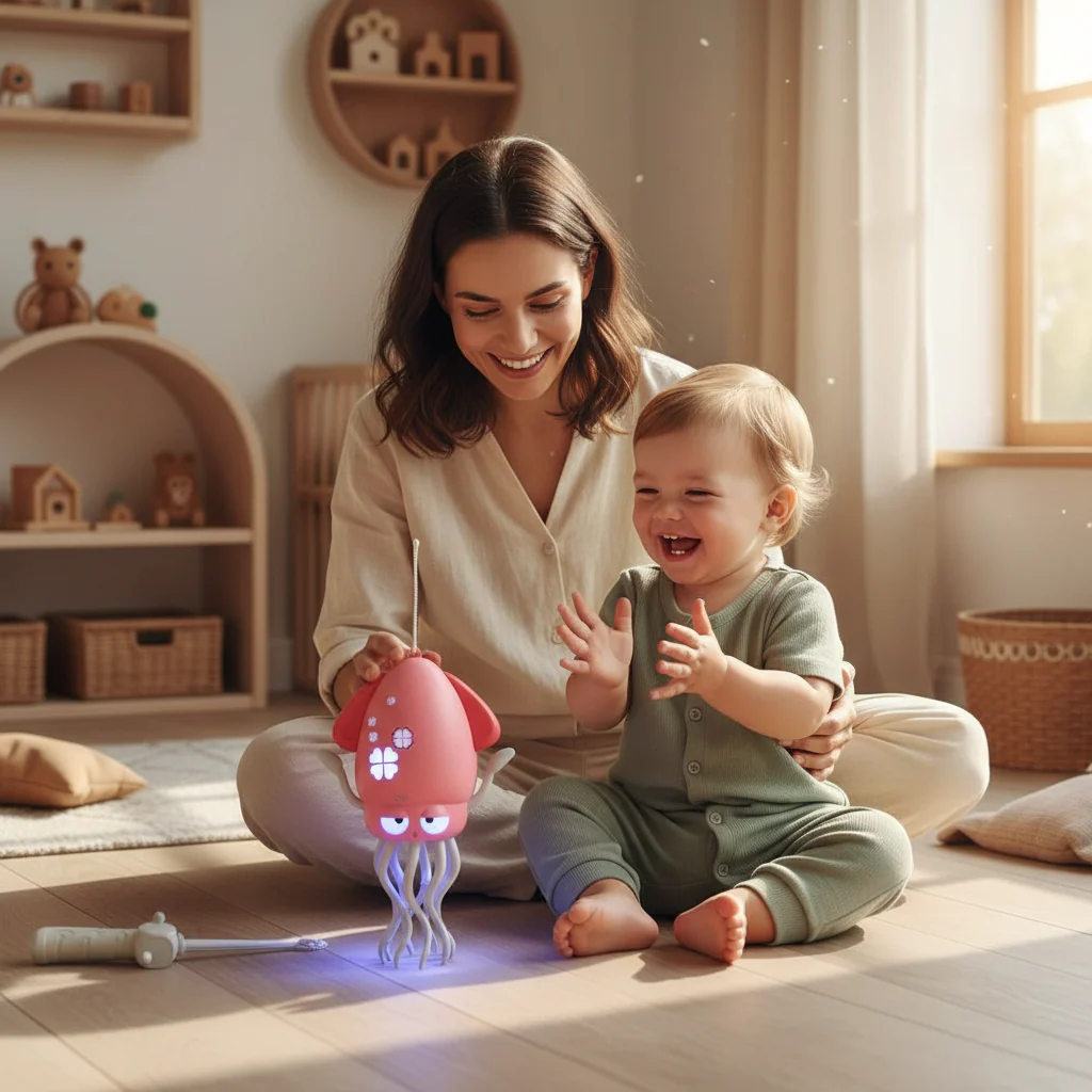 Poulpe dansant lumineux et musical avec LED multicolores. Jouet d’éveil sensoriel interactif qui danse, chante et apaise bébé. Textures douces et tentacules souples pour l’exploration tactile. Stimule le développement moteur et sensoriel des bébés de 3 mois à 3 ans. Matériaux sûrs certifiés CE et EN71.