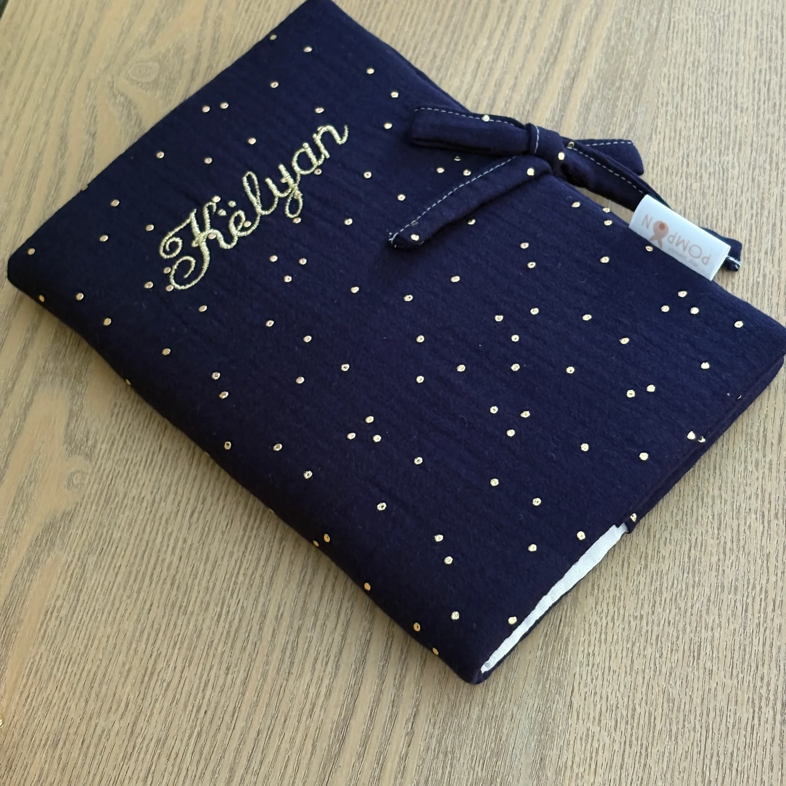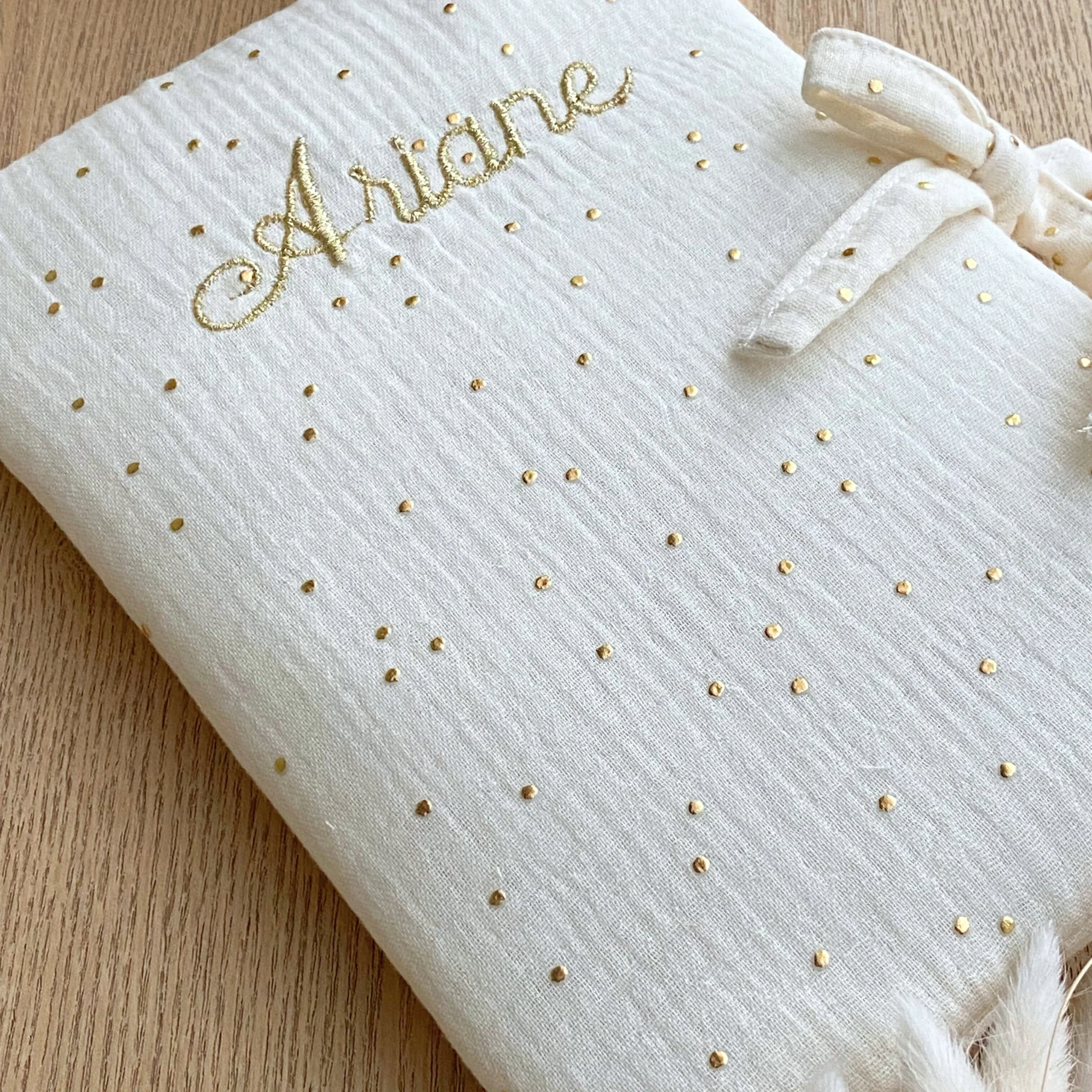 Personnalisez ce magnifique protège carnet de santé en gaze de coton avec le prénom de bébé.