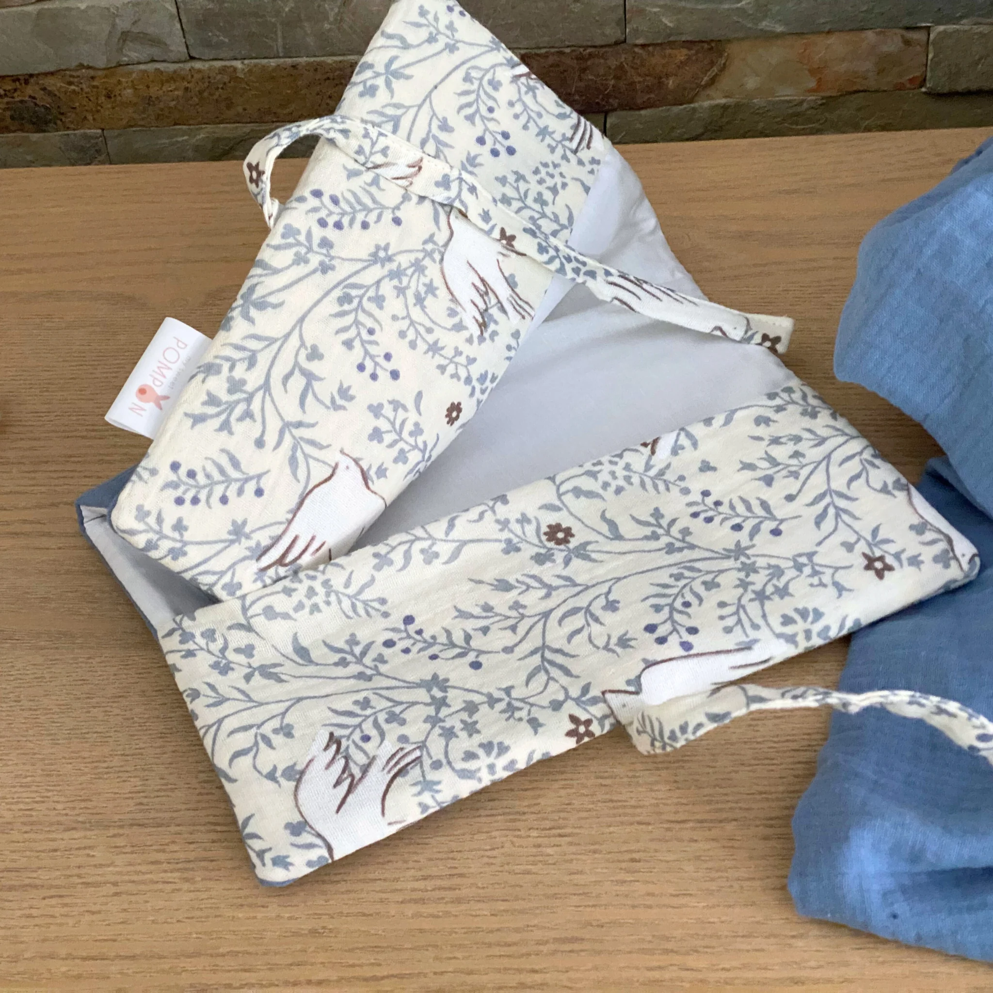 Double gaze écru à fleurs et motifs colombes bleu et marron.
