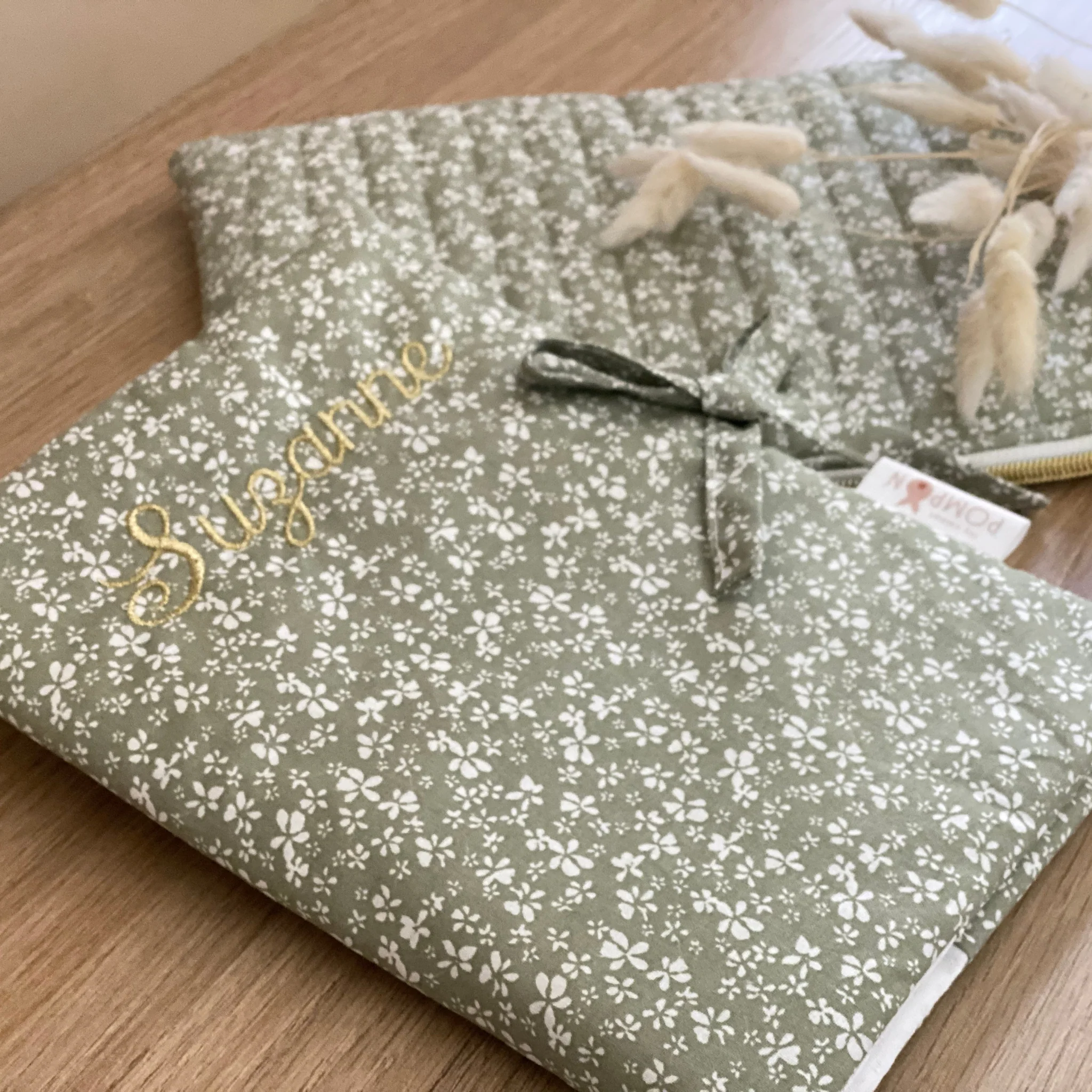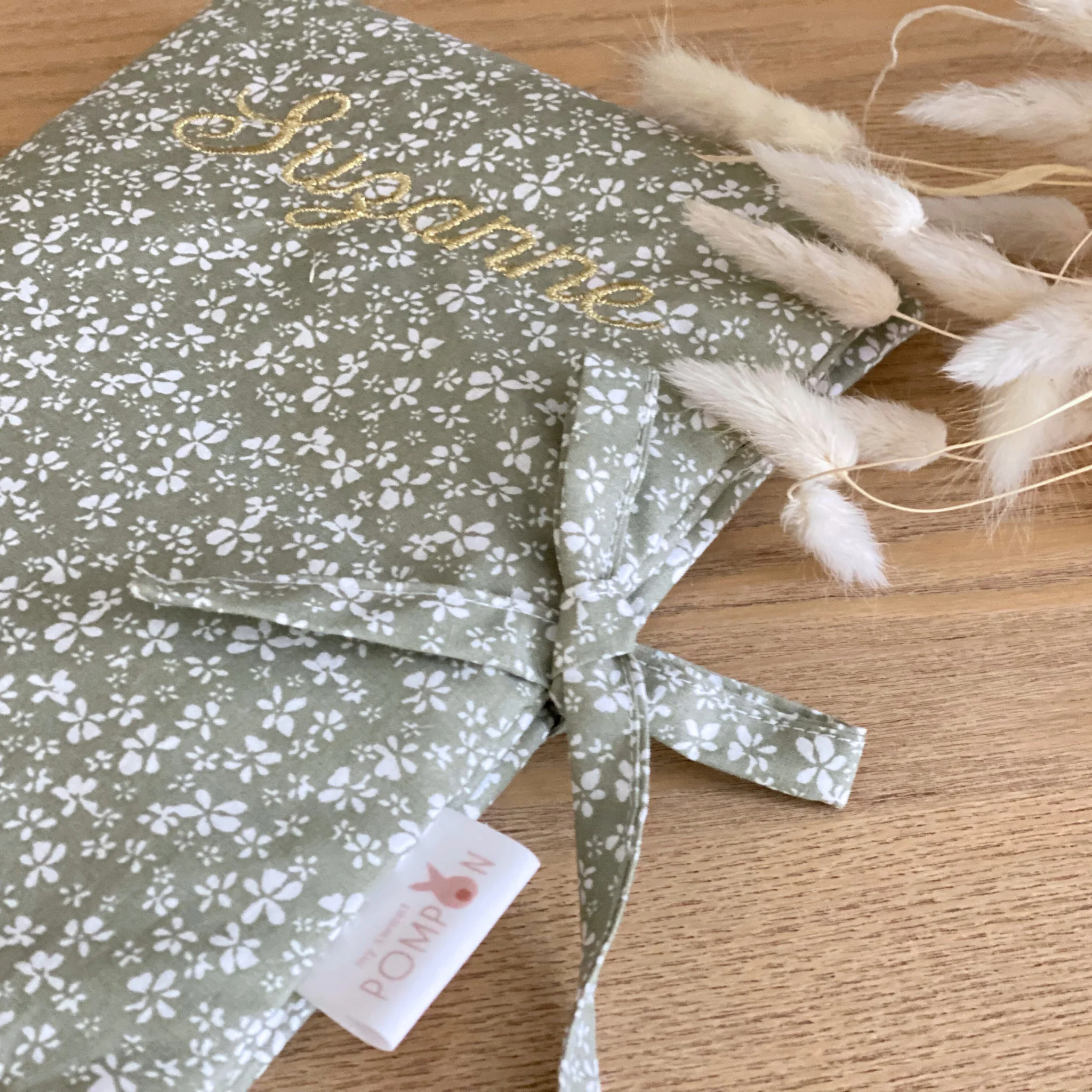 Le protège carnet de santé vert à fleurs pour fille avec personnalisation du prénom