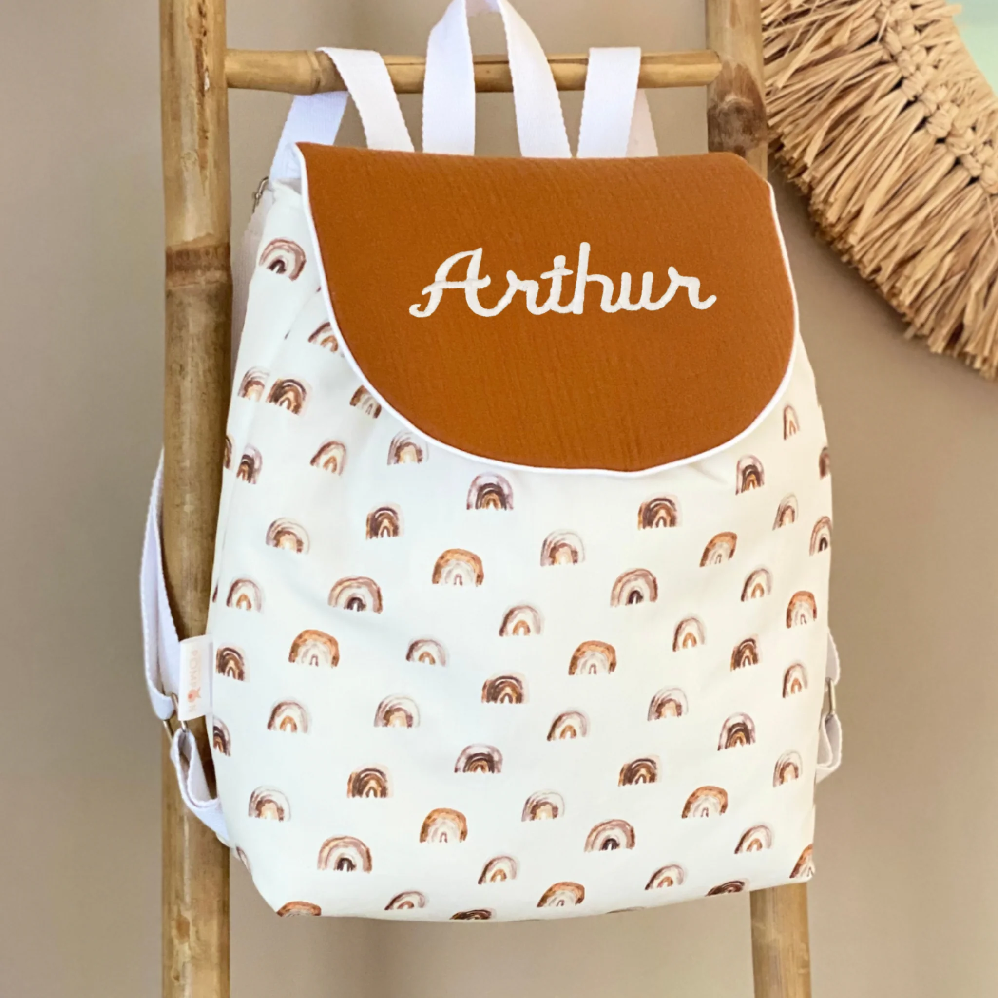 Un rabat avec broderie du prénom viendra fermer le sac grâce à un bouton aimant et élastique intérieur.