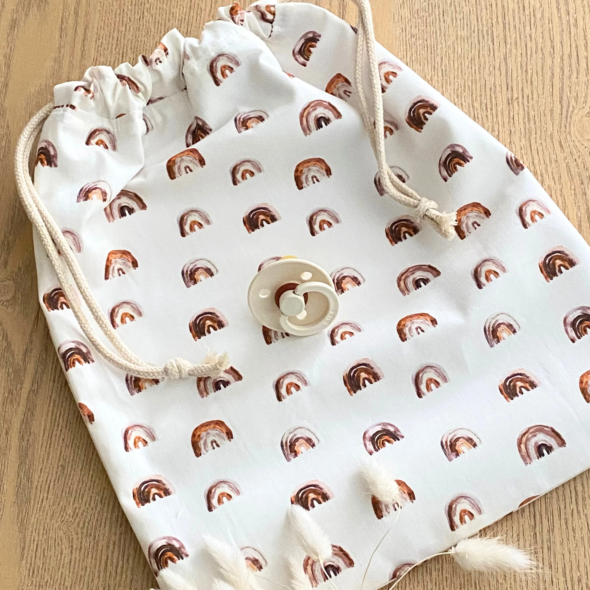 Entièrement fait main, il est composé d’un tissu en coton aux motifs arc en ciel