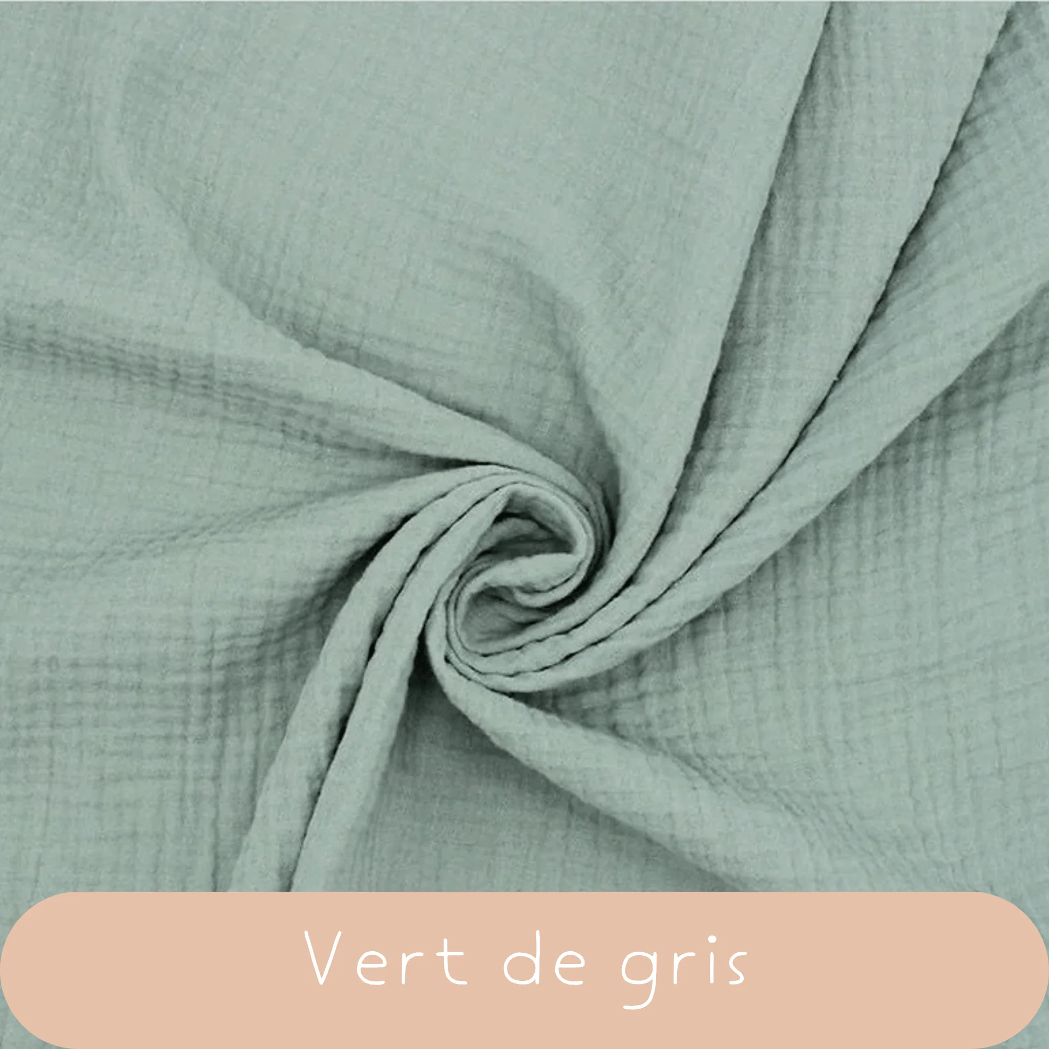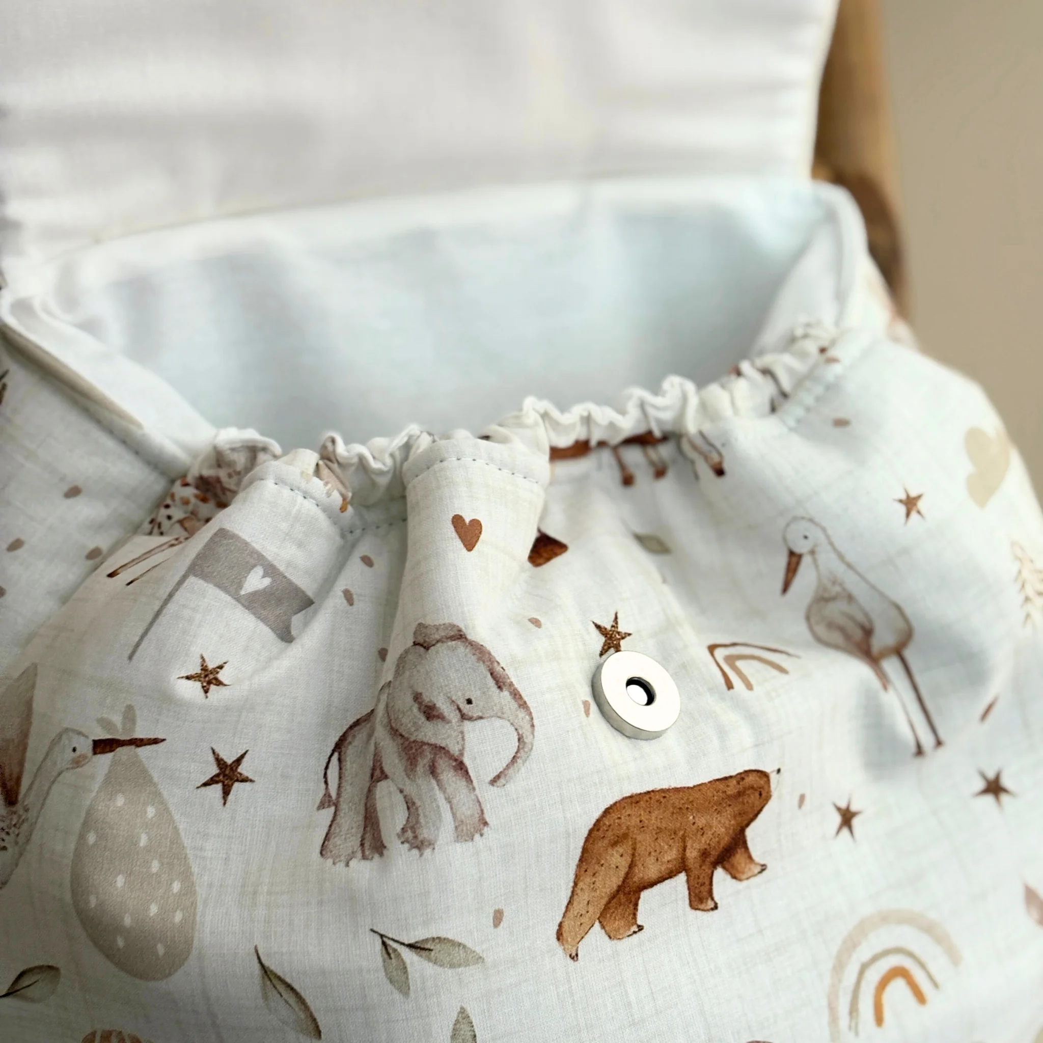 Un rabat en double gaze avec broderie prénom viendra fermer le sac grâce à un bouton aimant et élastique intérieur.