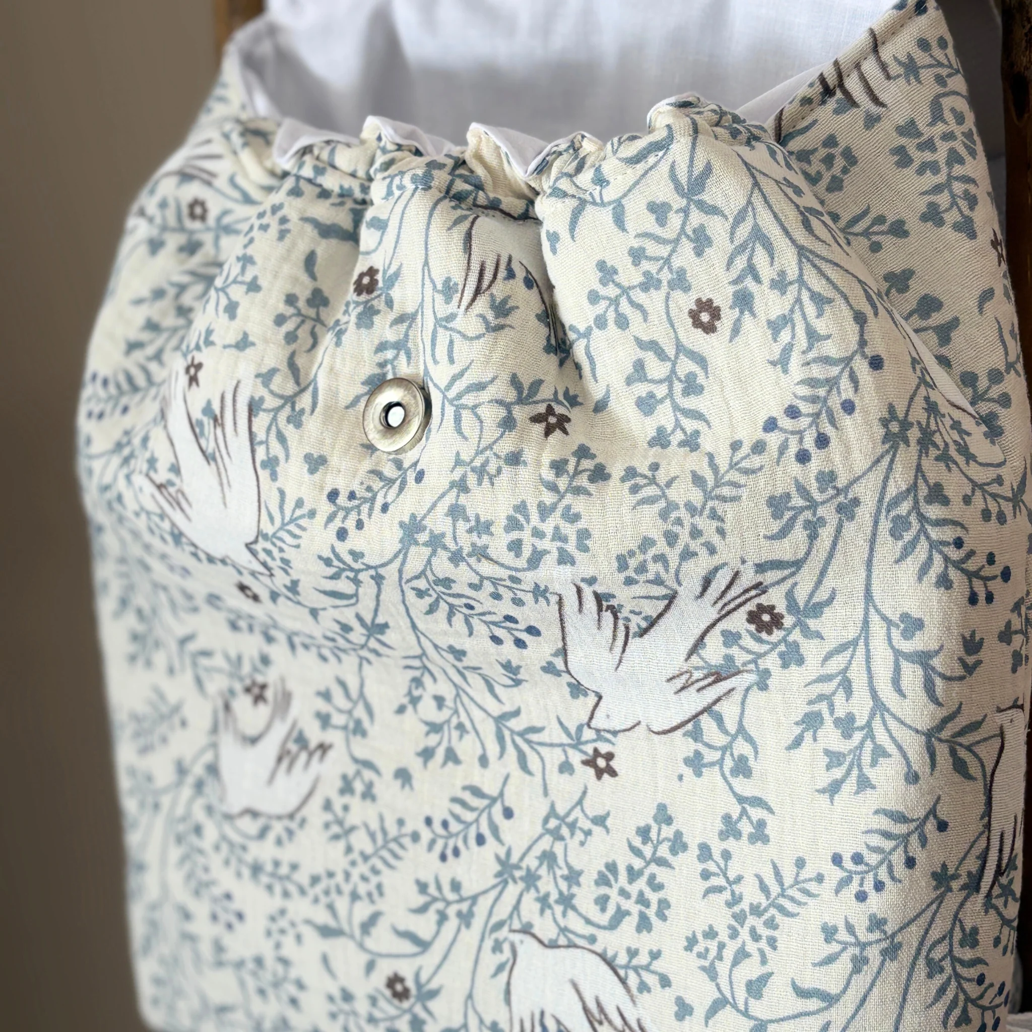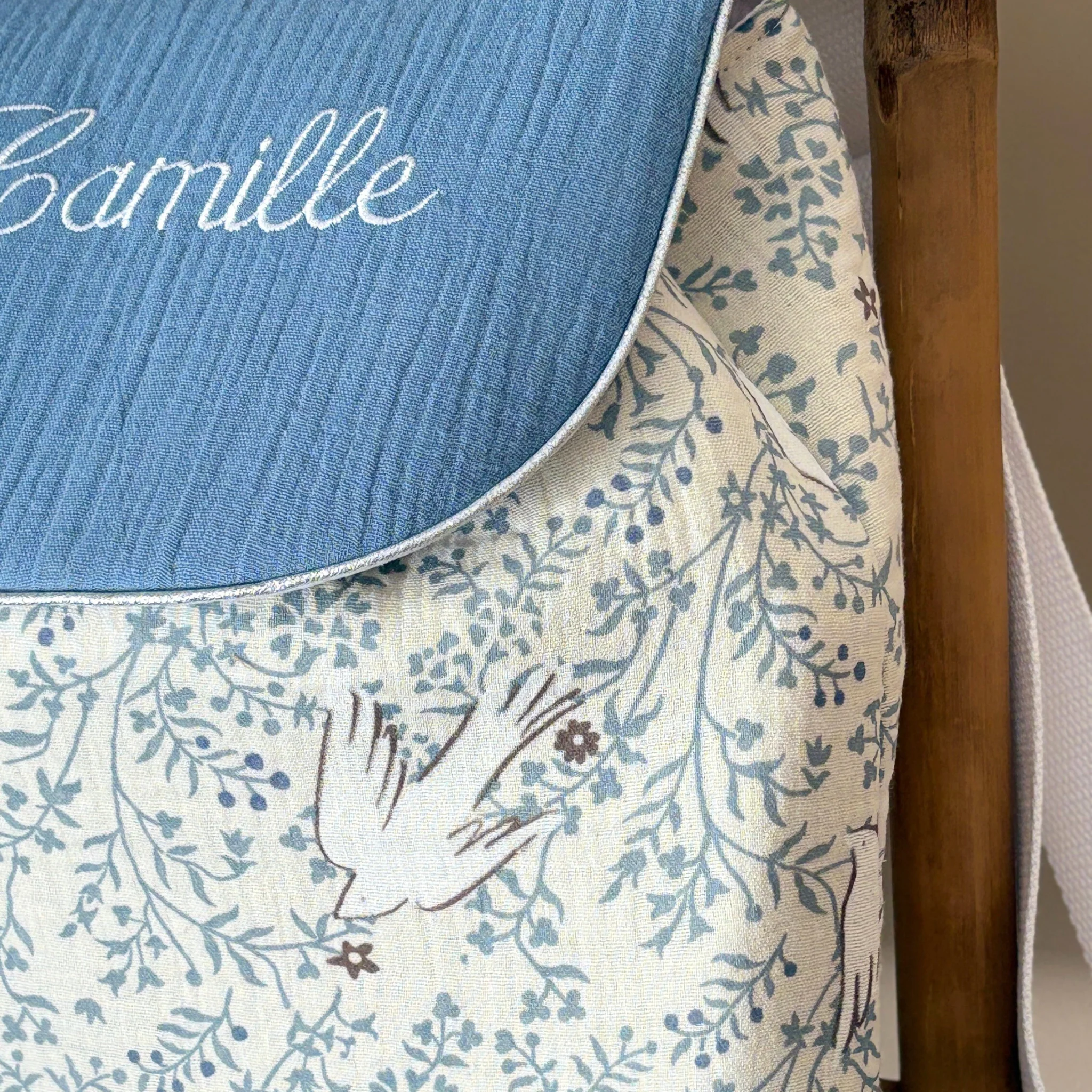 Un rabat en double gaze bleu avec broderie prénom viendra fermer le sac grâce à un bouton aimant et élastique intérieur.