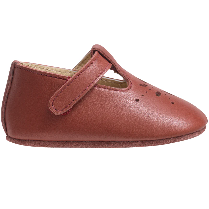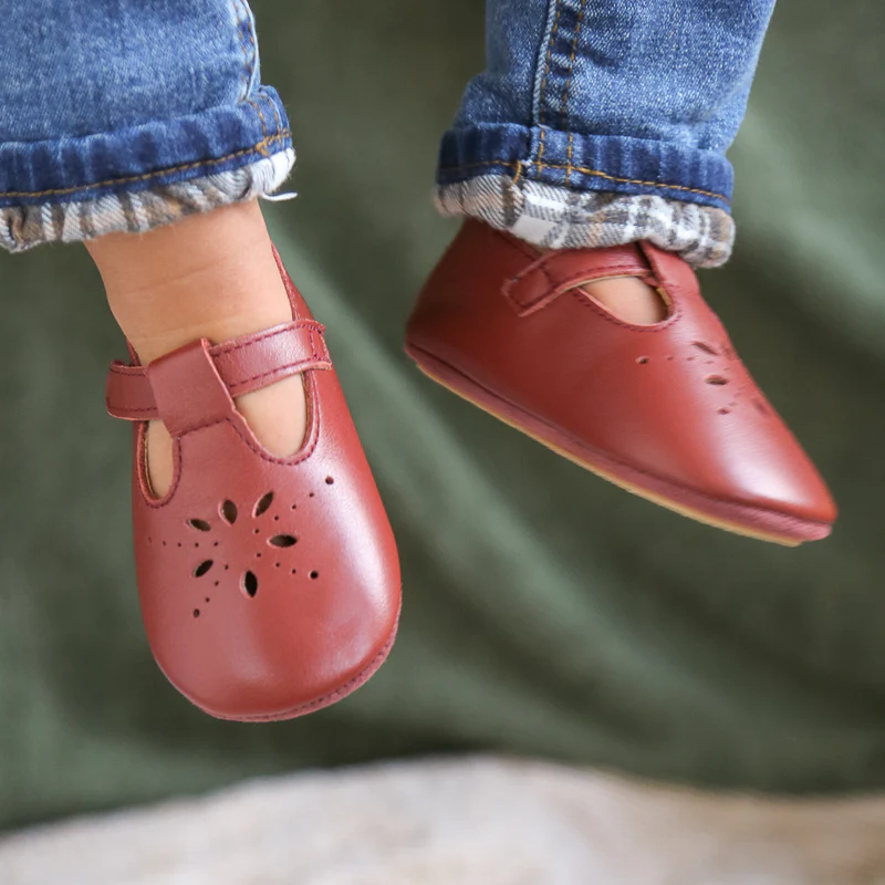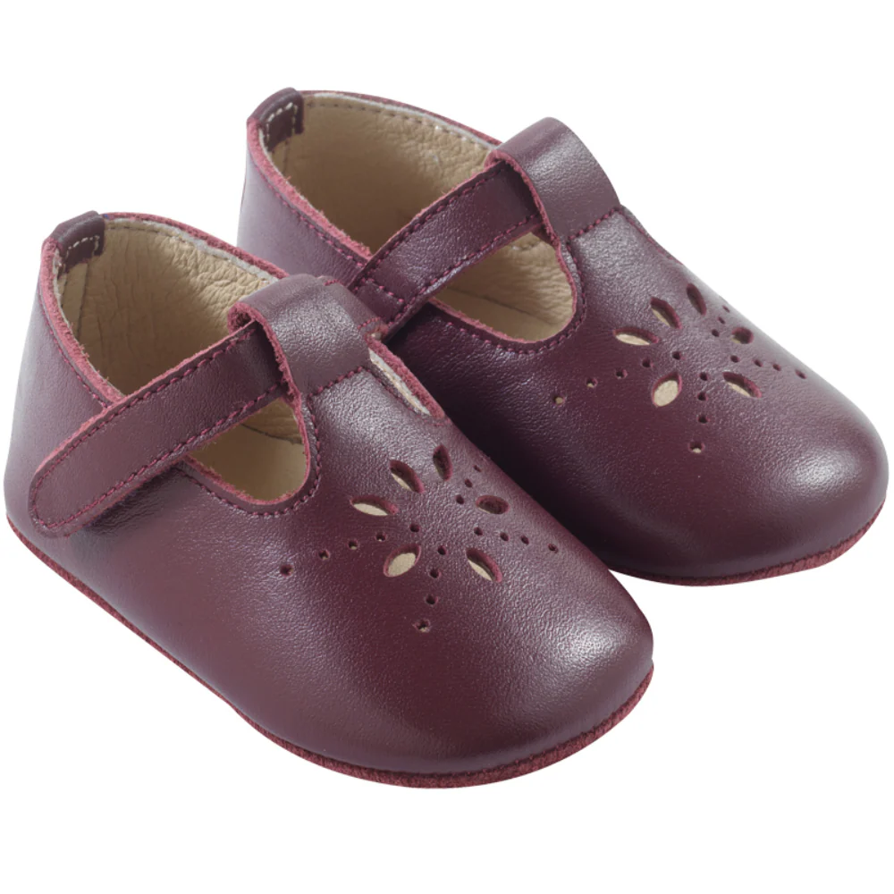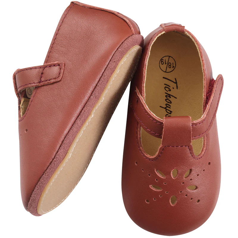 Chaussures bébé cuir souple adaptées pour l’intérieur et en extérieur par temps sec.