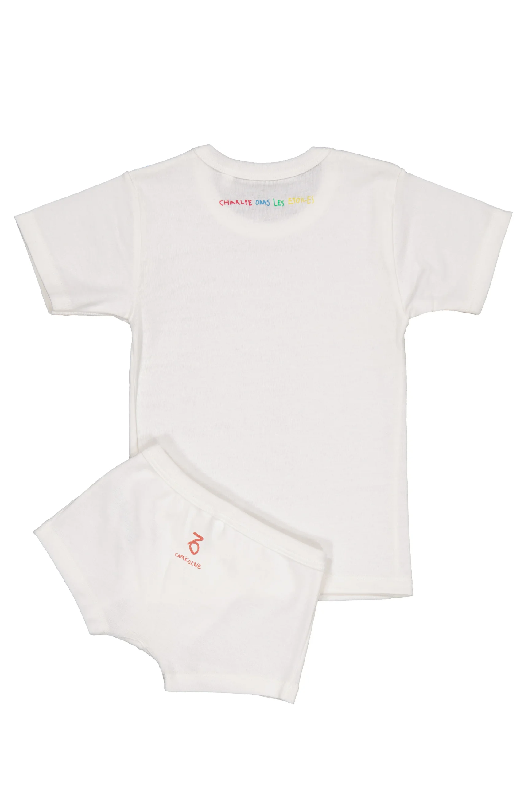 Imaginé par Charlie dans les étoiles, cet ensemble enfant composé d’un T-shirt manches courtes et d’un boxer assorti en coton bio certifié Oeko-Tex, accompagne les enfants de 2 à 6 ans dans leur quotidien, avec confort et liberté de mouvement.
